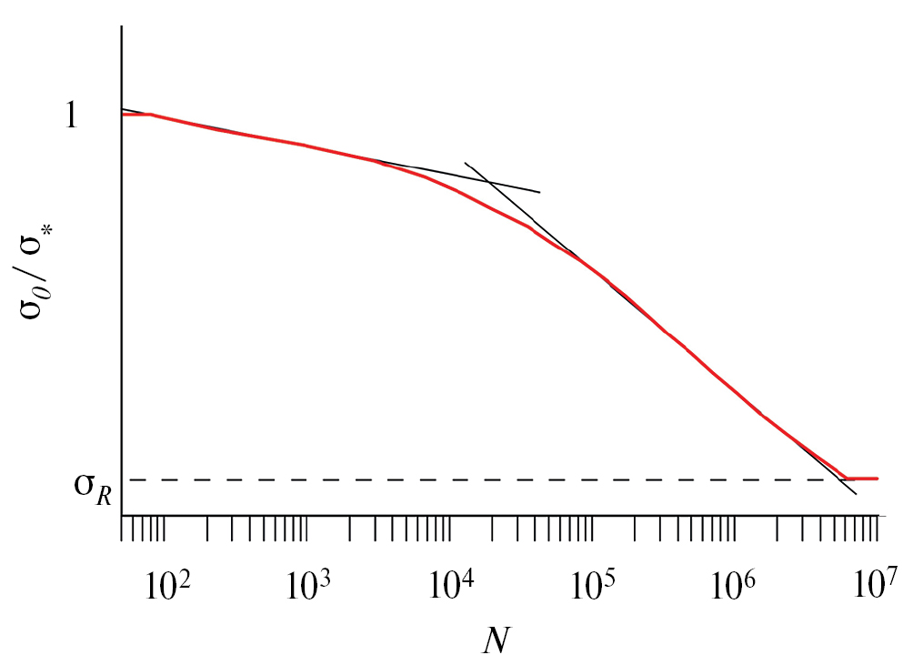 Как правило, различные участки общей усталостной кривой описываются комплексом разных моделей, базирующихся на различных подходах и трактовках экспериментальных данных. Обзоры работ по малоцикловой [1, 2], многоцикловой [3, 4] и сверхмногоцикловой усталости [5] показывают разнообразие существующих в теории усталостного разрушения подходов и отсутствие единого подхода для расчета S–N кривой. Однако в работе [6] авторы обращают внимание на то, что даже простой учет накапливающейся интенсивности напряжений у вершины трещины при импульсном динамическом циклировании позволяет в рамках линейной механики разрушения получить единую аналитическую формулу, дающую зависимость с тремя характерными участками.