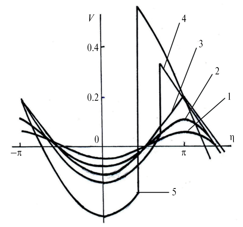 Решение (30), (31) изображено на рис. 3, кривые 4, 5. С ростом числа в области разрыв, появившийся в точке профиля (для ), стремится к положению , достигаемому при . Сплошные кривые 4, 5 построены для значений . Для отрицательной расстройки разрыв появится при в точке и будет смещаться с ростом числа в положение .