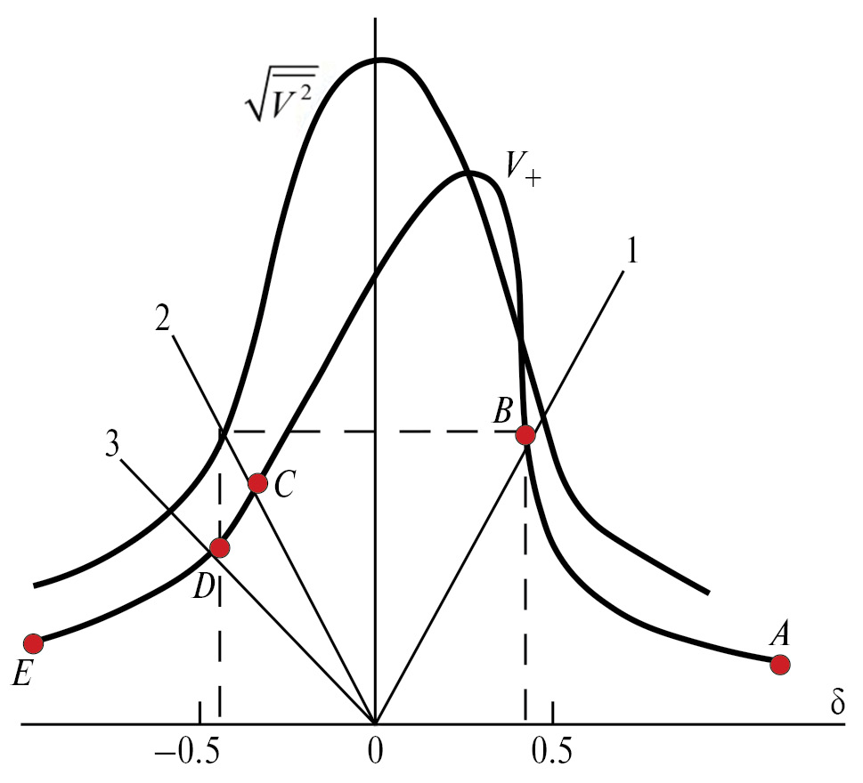 На рис. 4 изображена нелинейная резонансная характеристика для гармонического возбуждения. Она дает зависимость среднеквадратичной скорости от расстройки. Кривая построена для значения . Прямые линии