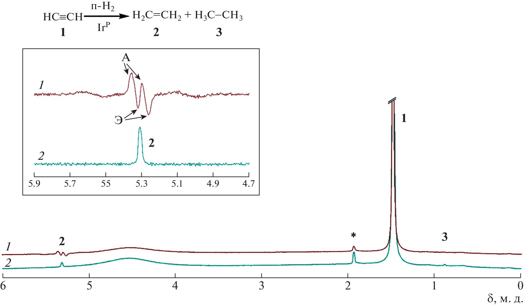 In this work rhodium and iridium immobilized complexes were prepared and characterized by X-ray photoelectron spectroscopy. For the first time, hyperpolarized 13C-ethylene was detected directly in the gas phase during acetylene hydrogenation with parahydrogen on immobilized iridium complexes. The line shape of polarized 13С‑ethylene unambiguously indicates that the hydrogen addition to the triple bond of acetylene on immobilized iridium complexes proceeds via syn-addition. It has been shown that the selective acetylene hydrogenation with parahydrogen over immobilized iridium complexes is an effective chemical method for enriching the nuclear spin isomers of ethylene.