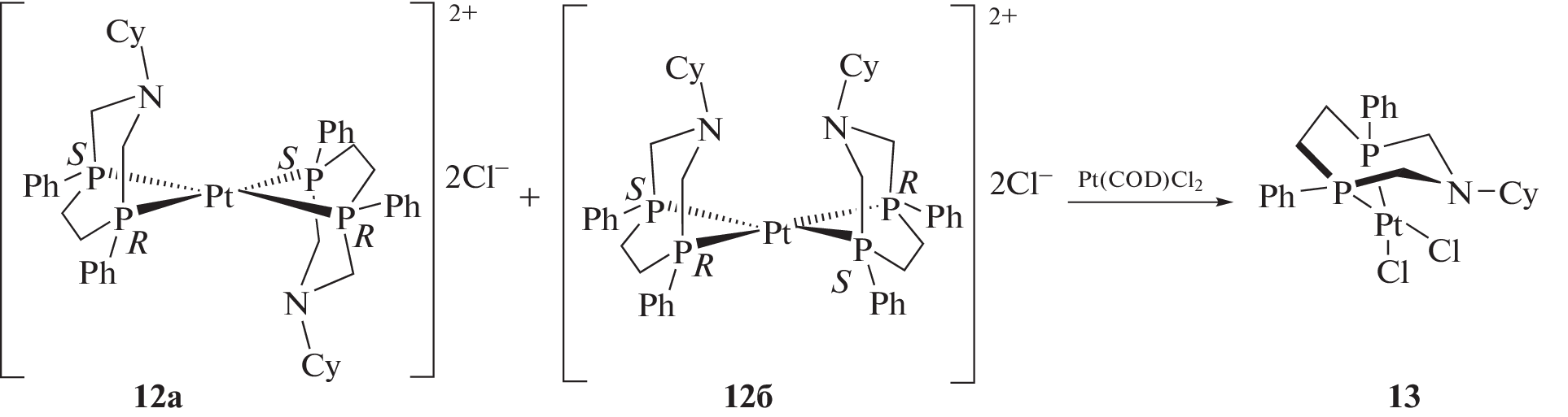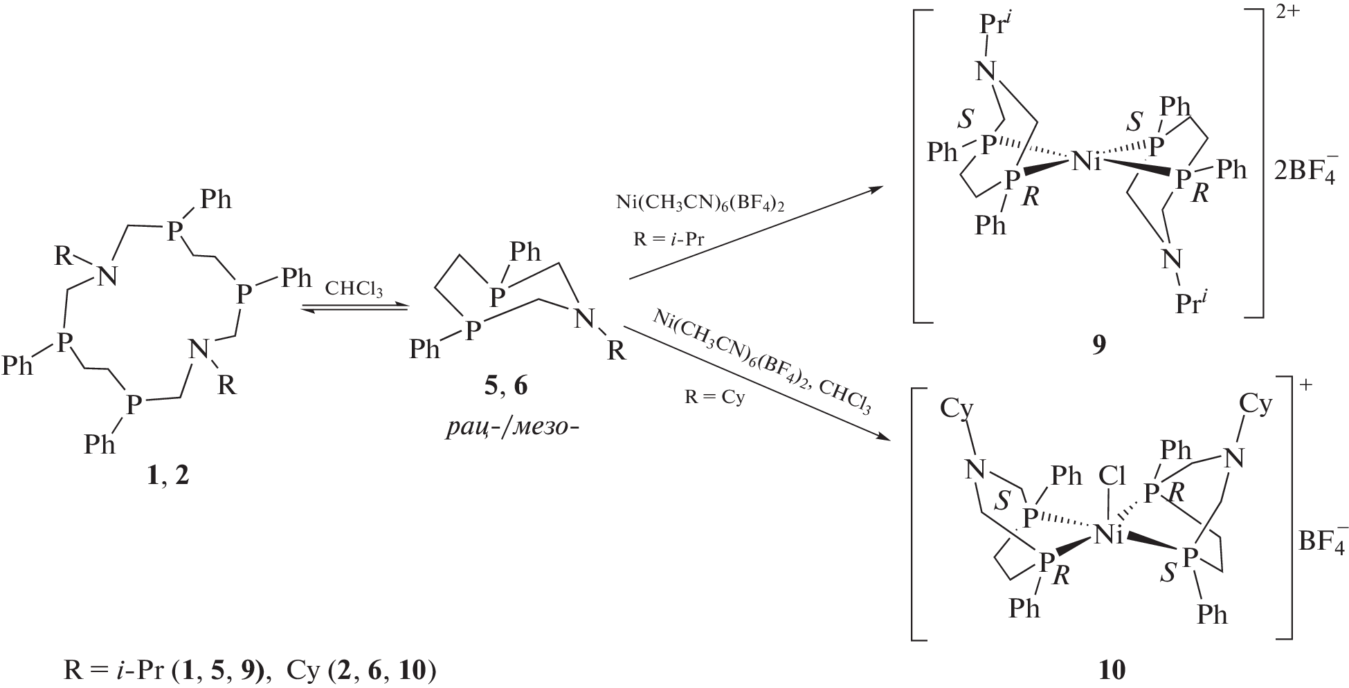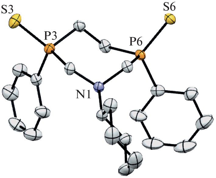 Предложен новый способ получения бис-фосфинсульфидов и хелатных комплексов никеля и платины 1,3,6-азадифосфациклогептанов, основанный на способности 14-членных 1,8-диаза-3,6,10,13-тетрафосфациклотетрадеканов претерпевать в растворах обратимое превращение в смесь мезо- и рац-изомеров 7-членных дифосфинов. При взаимодействии 1,8-диаза-3,6,10,13-тетрафосфациклотетрадеканов с серой в зависимости от условий проведения реакции образуются 14-членные тетрафосфинсульфиды или 7-членные дифосфинсульфиды. Реакция 1,3,6-азадифосфациклогептанов, формирующихся в результате обратимой диссоциации 14-членных тетрафосфинов в хлороформе, с Ni(CH3CN)6(BF4)2 или Pt(COD)Cl2 дает соответствующие хелатные комплексы. Структуры мезо-изомера дисульфида 1‑циклогексил-3,6-дифенил-1-аза-3,6-дифосфациклогептана, [бис(1-изопропил-1-аза-3,6,-дифенил-3,6-дифосфациклогептан)никель (II)] бис-тетрафторобората, бис-(κ2-1-циклогексил-3,6-дифенил-1-аза-3,6-дифосфациклогептан)хлороникель тетрафторобората и дихлоро[3,6-дифенил-1-циклогексил-1-аза-3,6-(RS)-дифосфациклогептан]платины (II), выделенных в кристаллическом виде, подтверждены данными рентгеноструктурного анализа.