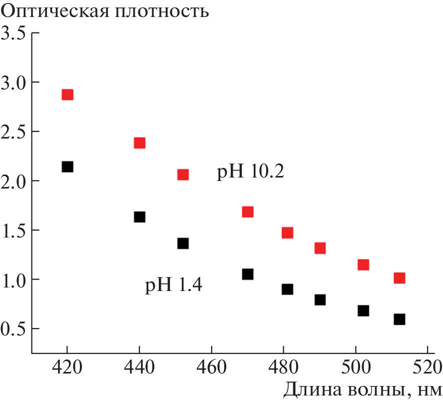 The effect of alkalinization of fulvic acids (FA) solutions on an increase in their optical density is studied. To explain the observed phenomenon, the investigation of FA particles in solutions with different pH was carried out using scanning electron microscopy (SEM) and scanning tunneling microscopy (STM). It was found that with an increase in pH, there is a noticeable decrease in the size of the observed supramolecular formations from FA from about 200 to 100 nm, and when studying FA samples on STM, it was shown that FA in solutions exist in the form of supramolecular formations several hundred nanometers in size, formed by particles-molecules of FA 10–20 nm. An explanation of the observed phenomenon was proposed based on existing ideas about the supramolecular fractal-cluster organization of humic substances (HS). It consists in the fact that the upper layer of F-clusters disintegrates into particles-molecules of FA with a decrease in their size observed with the help of SEM. At the same time, particles-molecules of FA due to their small size are not visible with the help of SEM, but they are well visualized when using STM.