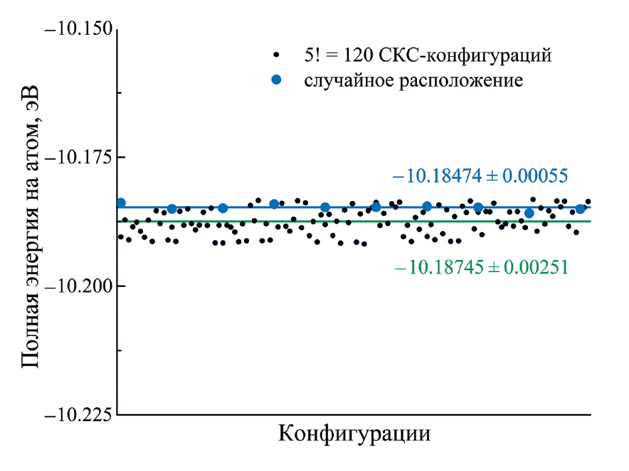 Рис. 1. Значение полной энергии системы на один атом для разных СКС-конфигураций (черные точки) и случайных конфигураций (синие точки) и их средние значения.