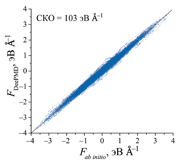 Качество полученного ИНС-потенциала оце- нивалось с помощью среднеквадратичных отклонений (СКО) для энергий и сил, рассчитанных с помощью данного потенциала, по срав- нению с результатами ab initio расчетов. Среднеквадратичное отклонение для энергии составляло порядка 10–3 эВ/атом. СКО для сил вносит основной вклад в функцию потерь и составляет 103 мэВ Å–1 (рис. 2), а значит, полученный потенциал хорошо воспроизводит ab initio данные.