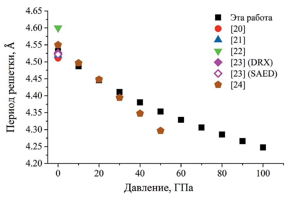 С использованием полученного ИНС-потенциала методом классической молекулярной динамики в программном пакете LAMMPS [19] исследовались структурные характеристики бездефектной модели указанного сплава, состоящей из 4096 атомов, при давлениях от 1 до 100 ГПа и температуре 300 К в ансамбле NPT при периодических граничных условиях. Временной отрезок атомных траекторий был равен 100 пс (50000 шагов). Рассчитанное уравнение состояния (зависимость периода решетки от давления) в сравнении с данными работ других авторов приведено на рис. 3. В целом период решетки при нулевом давлении совпадает с экспериментальными [21–23] и расчетными [20, 24] данными других авторов. Полученная зависимость периода решетки от давления в данной работе имеет экспоненциальный характер, тогда как в работе [24] только с применением метода DFT и суперячейки, состоящей из 64 атомов, получился линейный характер. Кроме того, в [24] не учитывались полуостовные состояния, и наши данные представляются более точными и физичными, так как параметр решетки не может меняться линейно вплоть до сверхвысоких давлений.