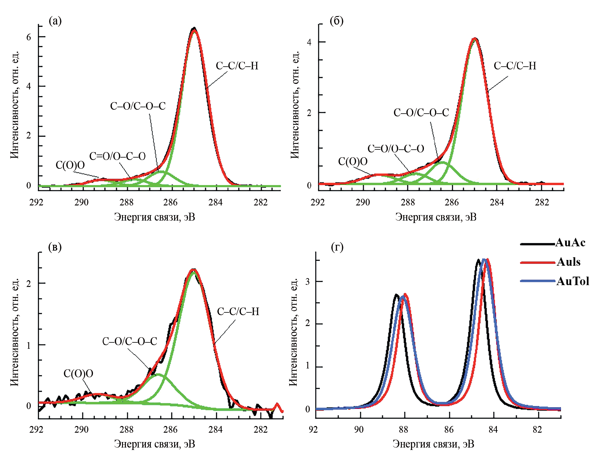 Рис. 4. Фотоэлектронные спектры C 1s образцов AuIs (а), AuAc (б), AuTol (в) и Au 4f всех исследуемых образцов (г).