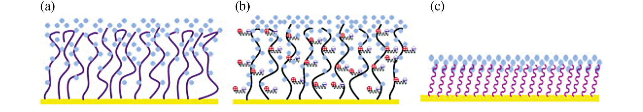 Рис. 1. Схема образования гидратационного слоя на гидрофильных полимерах (а), полимерах с цвиттер-ионами (b) и самособирающихся слоях (с) [29].