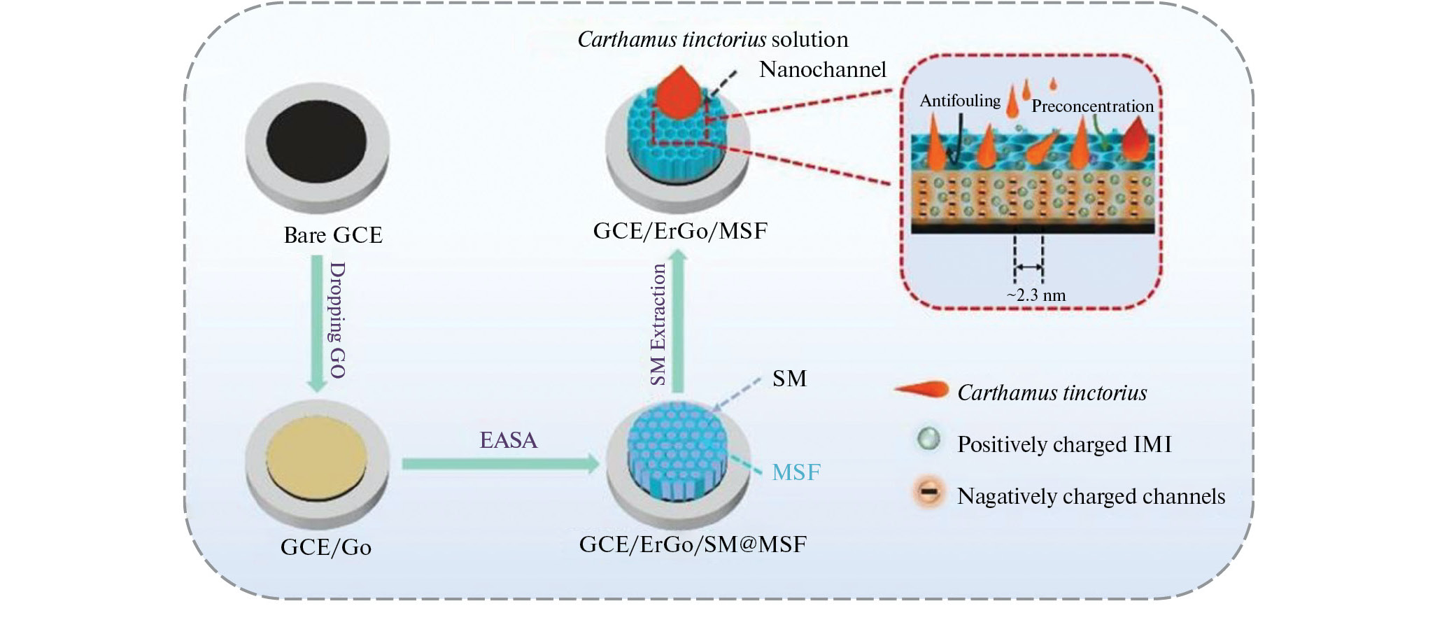Рис. 2. Схема модификации электрода мезопористым кремнеземом. GCE – стеклоуглеродный электрод (glassy carbon electrode), GO – оксид графена (graphene oxide), MSF – пленка мезопористого кремнезема (mesoporous silica film), SM – мицеллы поверхностно-активного вещества (surfactant micelles). Авторский рисунок на основании данных работы [45].