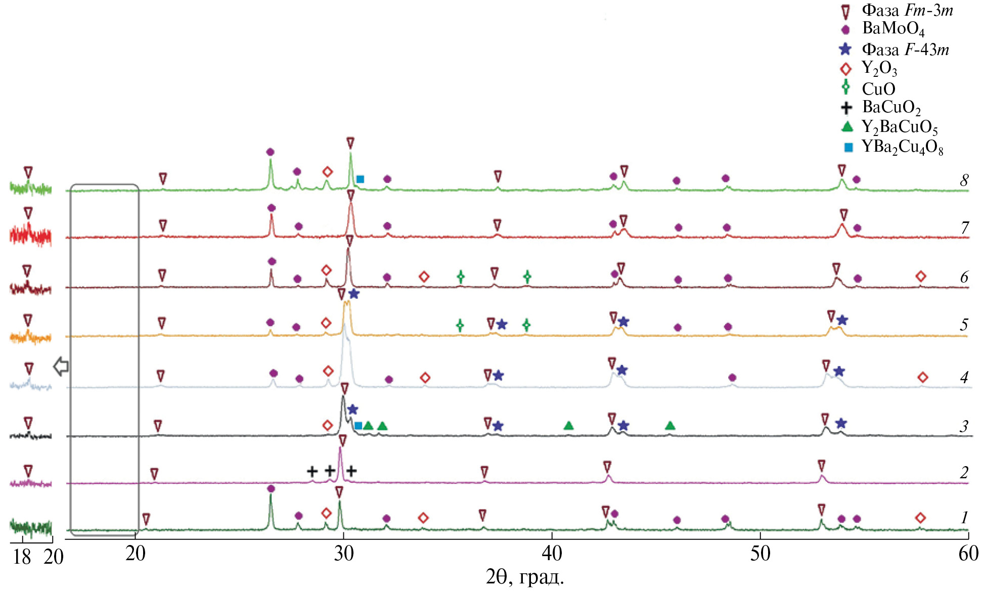 На рис. 2 приведены дифрактограммы образцов системы BaO–Y2O3–CuO–MoO3 с исходными соотношениями катионов металлов Ba : Y : Cu : Mo – 4112, 5212, 3111, 3121, 5221, 4211, 4(1.8)11, 8413.