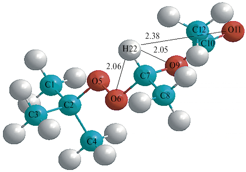Квантово-химический анализ структур ТБПЭ показал, что их свободное вращение в области значений торсионного угла 90°–280° практически не затруднено, они имеют неплоскостное (объемное) строение. Ацильный фрагмент молекул как обычно располагается в одной плоскости, а остальная ее часть находится почти в ортогональном положении к этой плоскости (рис. 1), что подтверждается величиной валентного угла O6–C7–H22 (105.7° ± 0.5°). Величина диэдрального угла C2–O5–O6– C7, составляющая 175.5°, является следствием специфических нековалентных взаимодействий, так как в их отсутствии этот угол практически для всех пероксидов находится в интервале 110° ± 25° [4]. Именно эта особенность отражается на положении атома водорода H22 у третичного атома углерода C7, который оказался равноудаленным от кислорода пероксидной группы О6 на 2.05 ± 0.01 Å и эфирного О9 на 2.06 ± 0.001 Å, но не карбонильного О11 (2.38 ± 0.05 Å) (рис. 1).