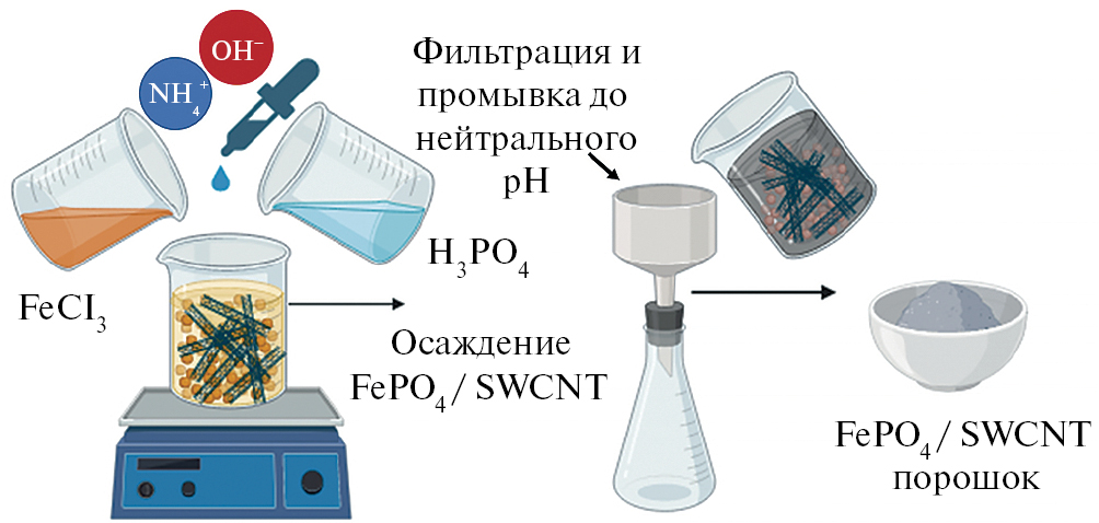 Синтез феррофосфата лития методом осаждения. В стабильную дисперсию одностенных углеродных нанотрубок марки Tuball (OCSiAl, Россия) с концентрацией 0.025 мас. % вносили 0.3 М водный расвор FeCl3 при постоянном перемешивании. Температура раствора составляла ~50°С. Затем по каплям вносили эквимолярное количество ортофосфорной кислоты H₃PO₄ (мольное соотношение ионов Fe³⁺ к составляло 1 : 1). Полученный раствор нагревали при постоянном перемешивании до температуры 90–95°С и прикапывали 25%-й водный раствор аммиака для инициации процессов осаждения гидратированного фосфата железа (рис. 1).