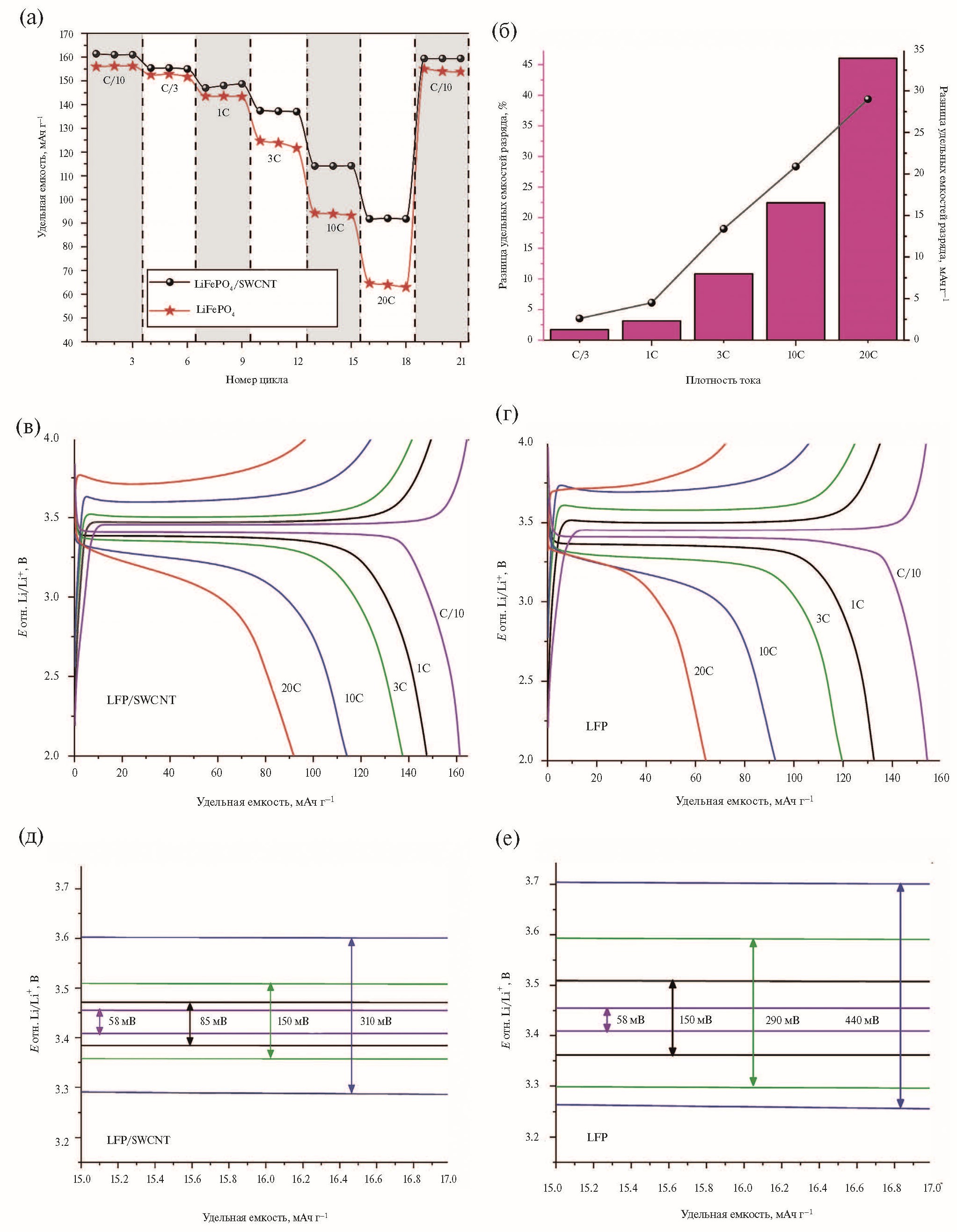 На основании представленных графиков гальваностатических профилей заряда/разряда при различных плотностях тока для материалов LFP/SWCNT и LFP (рис. 4в,г) можно сделать вывод, что оба материала демонстрируют протяженное разрядное плато, типичное для структуры LFP [60]. С увеличением плотности тока возрастает величина перенапряжения, вызванного общим сопротивлением, которое складывается как из омических потерь, так и из кинетических и диффузионных ограничений транспорта носителей заряда [61]. На рис. 4д,е представлены выделенные области зарядно-разрядных кривых, позволяющие оценить вклад общего сопротивления системы в эффективность работы аккумулятора. Очевидно, что с ростом плотности тока значительно возрастает величина гистерезиса перенапряжения на зарядно-разрядных кривых. Это связано с необратимыми затратами энергии на преодоление внутренних сопротивлений в структуре катодного материала, вызванных, в том числе, низкой электропроводностью катодного слоя [62, 63]. Введение SWCNT в структуру частиц активного материала способствует значительному снижению величины гистерезиса перенапряжения на зарядно-разрядных кривых (рис. 4е). Таким образом, можно сделать вывод, что инкапсулирование одностенных углеродных нанотрубок в структуру LFP способствует существенному улучшению эксплуатационных характеристик катодного материала.