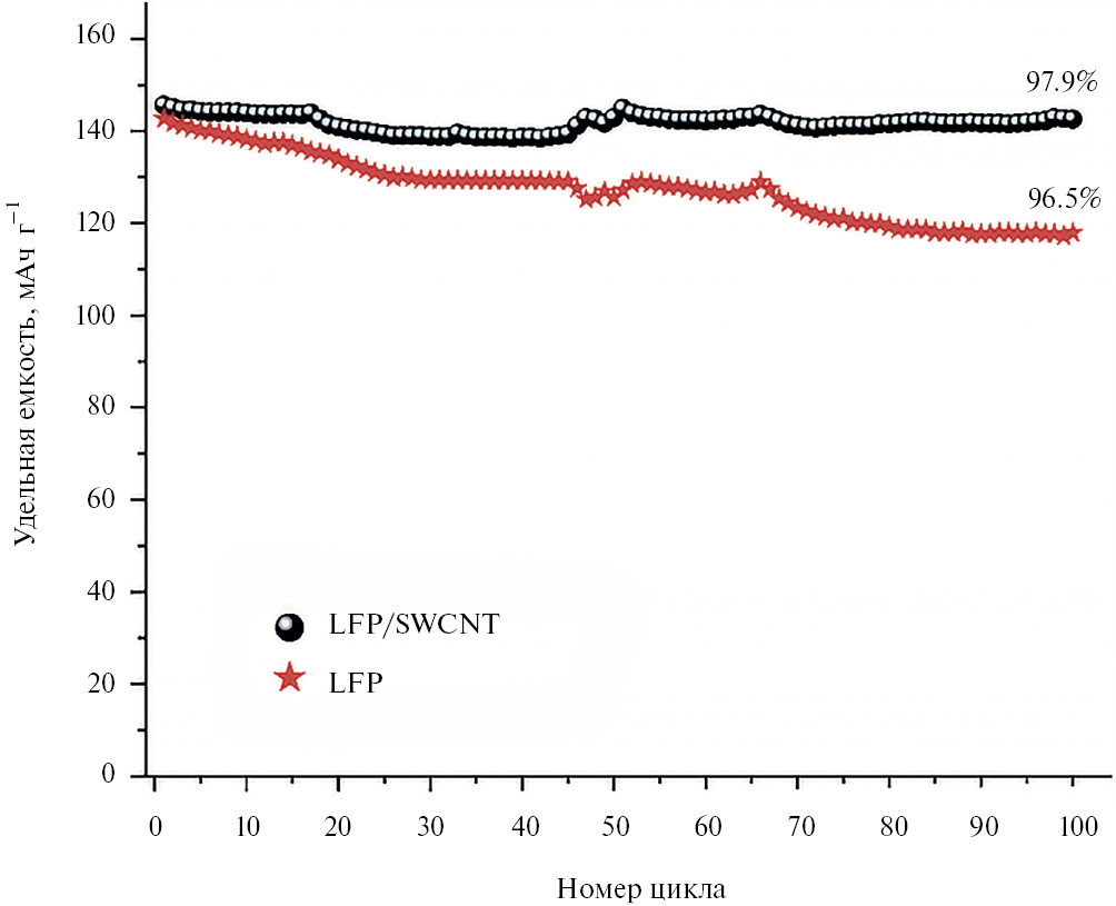 На основании исследования циклической стабильности можно видеть, что композиционный материал LFP/SWCNT демонстрирует обратимую емкость 140 мАч г ⁻¹ после 100 циклов заряда/разряда, т. е. коэффициент сохранения емкости составил 98%. Для образца, не содержащего SWCNT, обратимая емкость после 100 циклов составила 137 мАч г ⁻¹, или 96.5% от исходной. Таким образом создание объемной проводящей сети SWCNT в материале LFP/SWCNT обеспечивает постоянный контакт частиц активного материала с углеродным каркасом, в результате чего удается практически полностью исключить негативные процессы вывода из электрохимической реакции активного материала. При этом углеродные нанотрубки, обладающие развитой удельной поверхностью, как правило, могут способствовать поверхностной адсорбции с последующим разложением электролита, что негативно отражается на электрохимических характеристиках. Однако синтезированный композиционный материал оказывается стабильным в указанном диапазоне циклирования. Следует отметить, что в обоих случаях в фактическое снижение емкости вносят вклад не только процессы в материале положительного электрода, но и деградация литиевого противоэлектрода, вызванная образованием нерастворимого поверхностного слоя переменного состава и структуры, снижающего кинетику интеркаляционных процессов [62, 63].
