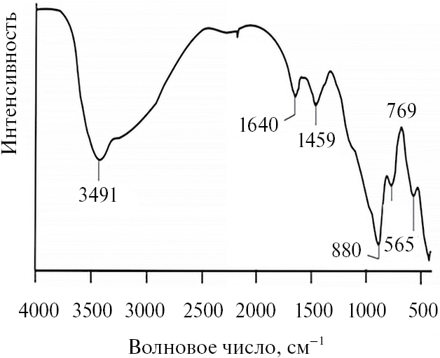 Рис. 2. ИК-спектр образца сорбента из состаренного осадка СТА-П-С.