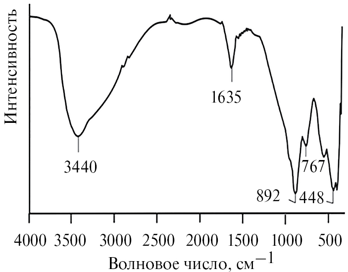 Анализ расположения основных (наиболее интенсивных) полос поглощения на ИК-спектрах титаносиликатных сорбентов позволяет сделать следующие выводы. Полосы в диапазоне 3196–3430 см⁻¹, которые характерны для всех исследуемых образцов, относятся к растягивающим и изгибающим колебаниям O–H-связи свободной воды, а колебания при 1640–1650 см⁻¹ – к кристаллизационной воде. Полосы поглощения в диапазоне 1450–1460 см⁻¹ на ИК-спектрах сорбентов, полученных из состаренных осадков, обработанных раствором соляной кислоты, обусловлены колебаниями связей Si–OH (рис. 3). Поглощение в области 860–900 см⁻¹, характерное для растягивающих колебаний Ti–O–Si, наблюдается на ИК-спектрах всех исследуемых образцов, что подтверждает наличие в образцах данной химической связи (рис. 1–3). Полосы поглощения в диапазоне 560–770 см⁻¹ относятся к асимметричным и изгибным колебаниям силоксановой связи Si–O–Si и растягивающим колебаниям Ti–O–Ti, что указывает на существование индивидуальных фаз в виде SiO2 и TiO2 во всех образцах. Эти полосы поглощения характерны для всех образцов и отличаются небольшими отклонениями по интенсивности и значению волнового числа.