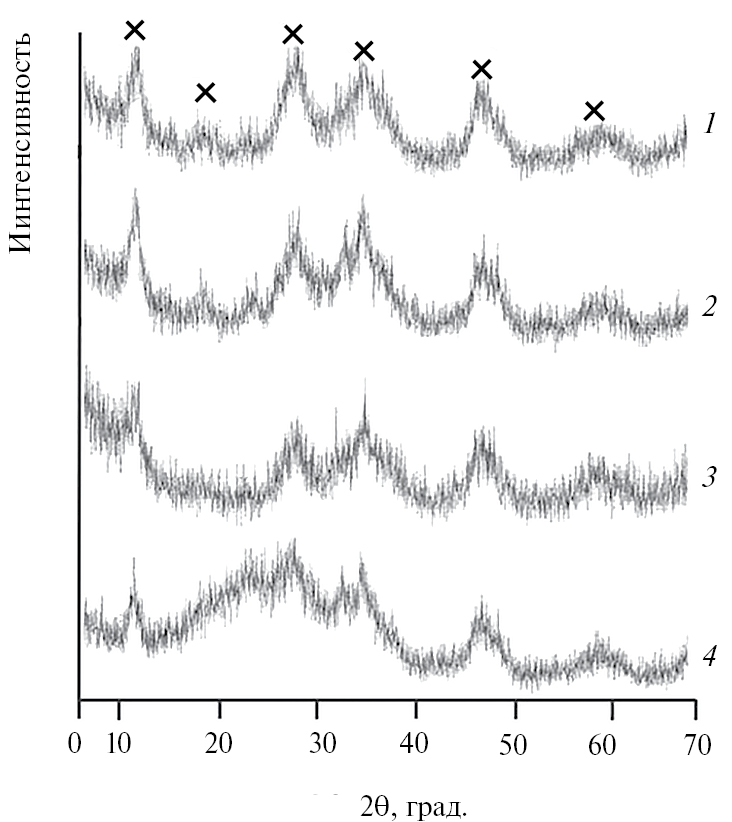 Рис. 5. Дифрактограммы образцов сорбента с использованием СТМ: СТМ-0-С (1), СТМ-П-С (2), СТМ-П-С-1 (после обработки сорбента раствором HCl, Т : Ж = 1 : 3) (3), СТМ-П-С-2 (после обработки сорбента раствором HCl, Т : Ж = 1 : 6) (4). Обозначения: × – иванюкит.