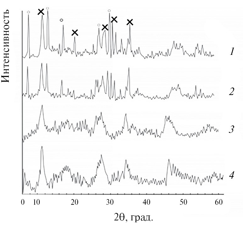 Рис. 6. Дифрактограммы сорбентов, полученных из состаренных титаносиликатных осадков, после обработки их раствором НСl: СТА-П-1С (1), СТА-П-2С (2), СТМ-П-1С (3), СТМ-П-2С (4). Обозначения: × – иванюкит, о – зорит.