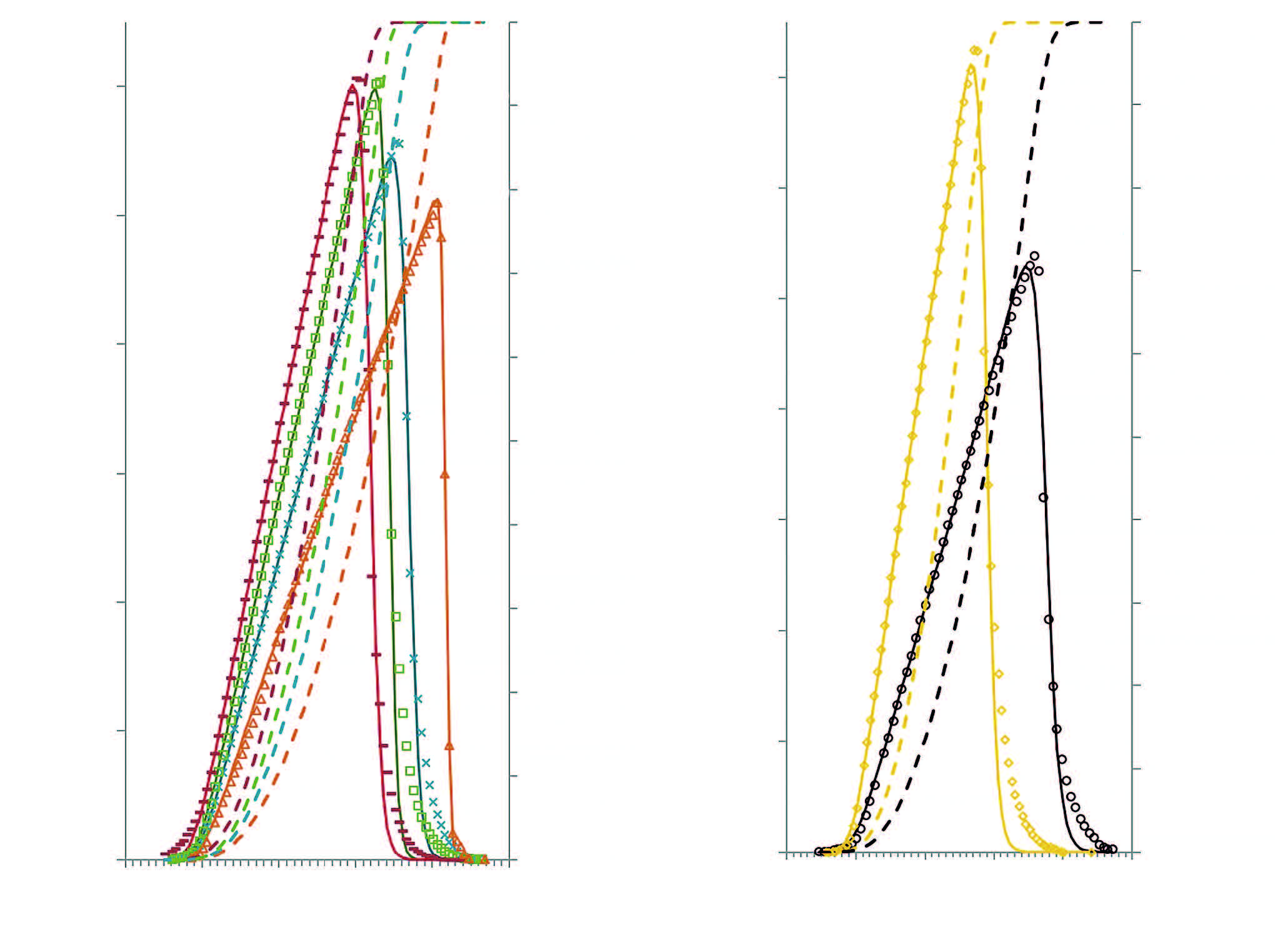 На рис. 1 представлены термограммы плавления – пиковые по характеру температурно-временные зависимости, которые в соответствии с ДСК экспериментом (символы) отражают скорость плавления и теоретически описываются сплошными линиями. На том же рисунке пунктирная линия того же цвета отображает степень превращения кристалла в расплав.