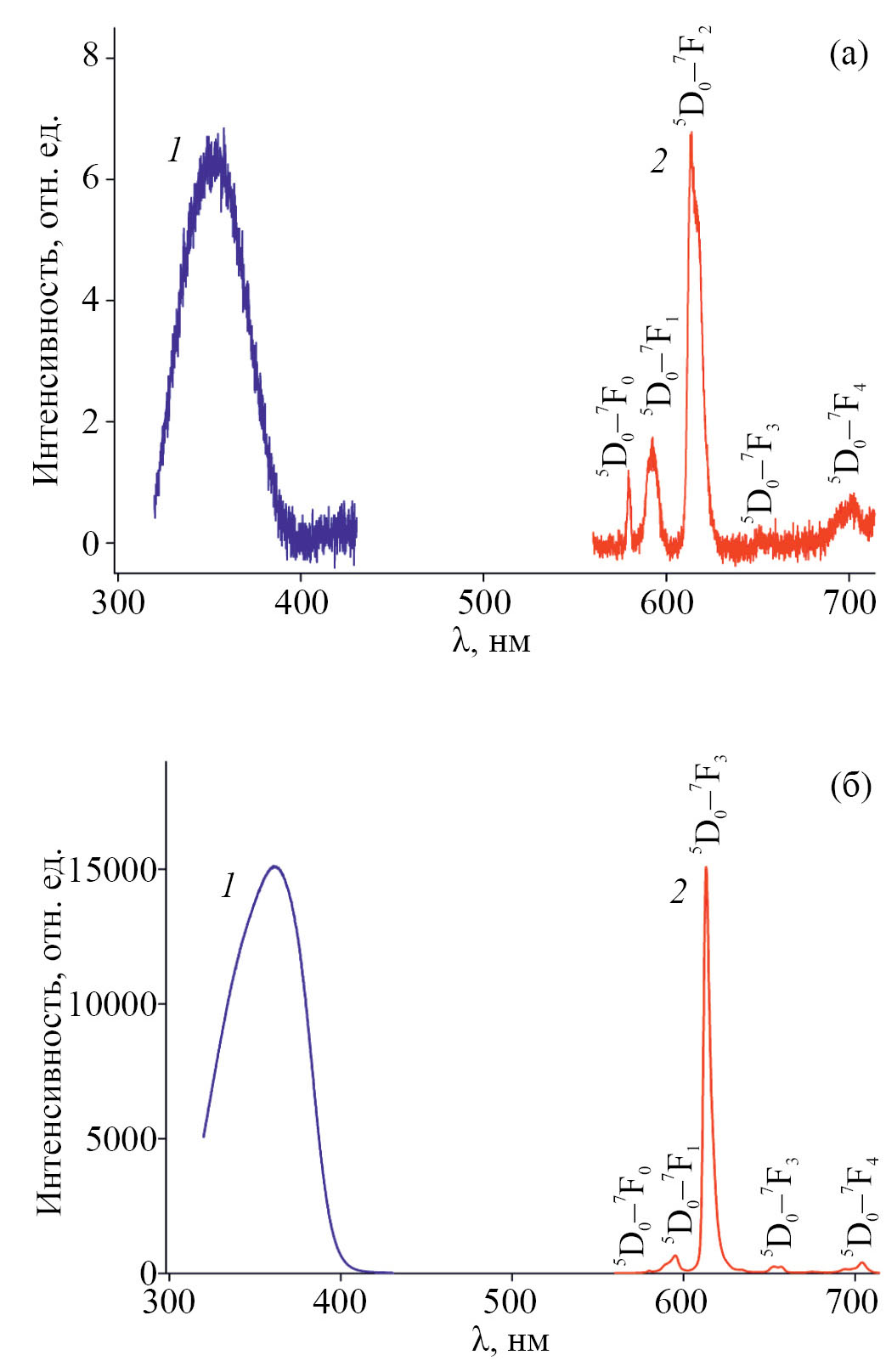 Рис. 1. Спектры возбуждения (кривая 1, λлюм = 613 нм) и люминесценции (кривая 2, λвозб = 360 нм) водных растворов, содержащих 40 мкМ Eu(III) и 400 мкМ ТТА в отсутствие НИА (а) и в присутствии 50 мкМ НИА (б).