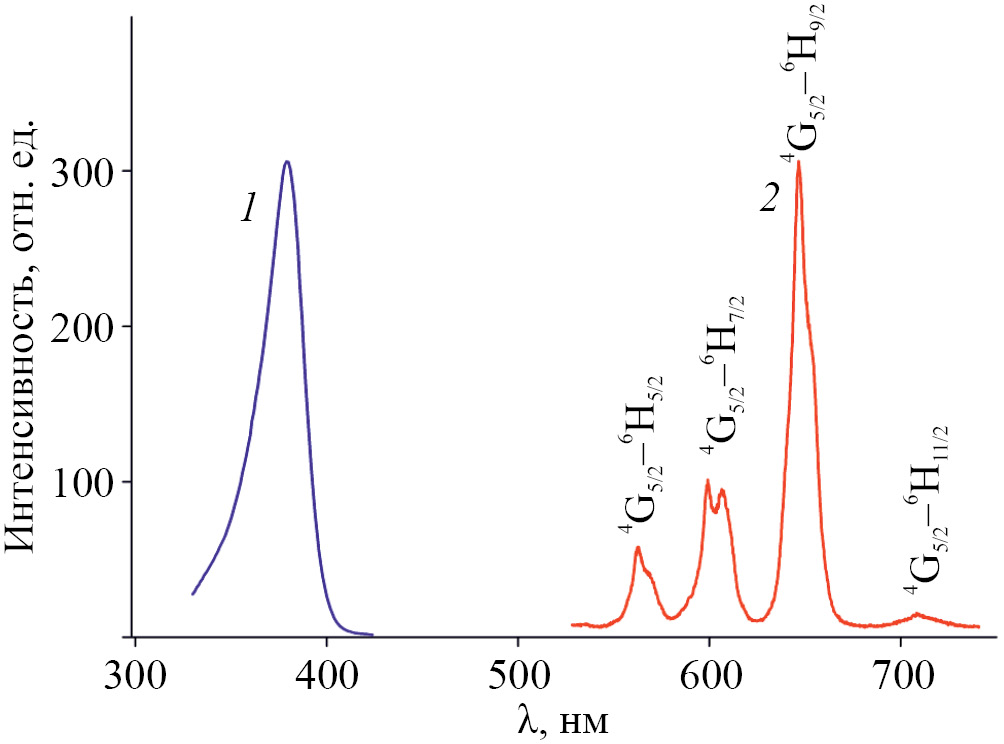 Рис. 2. Спектры возбуждения (кривая 1, λлюм = 647 нм) и люминесценции (кривая 2, λвозб = 380 нм) водных растворов, содержащих 50 мкМ Sm(III) и 2 мМ ТТА в присутствии 250 мкМ НИА.