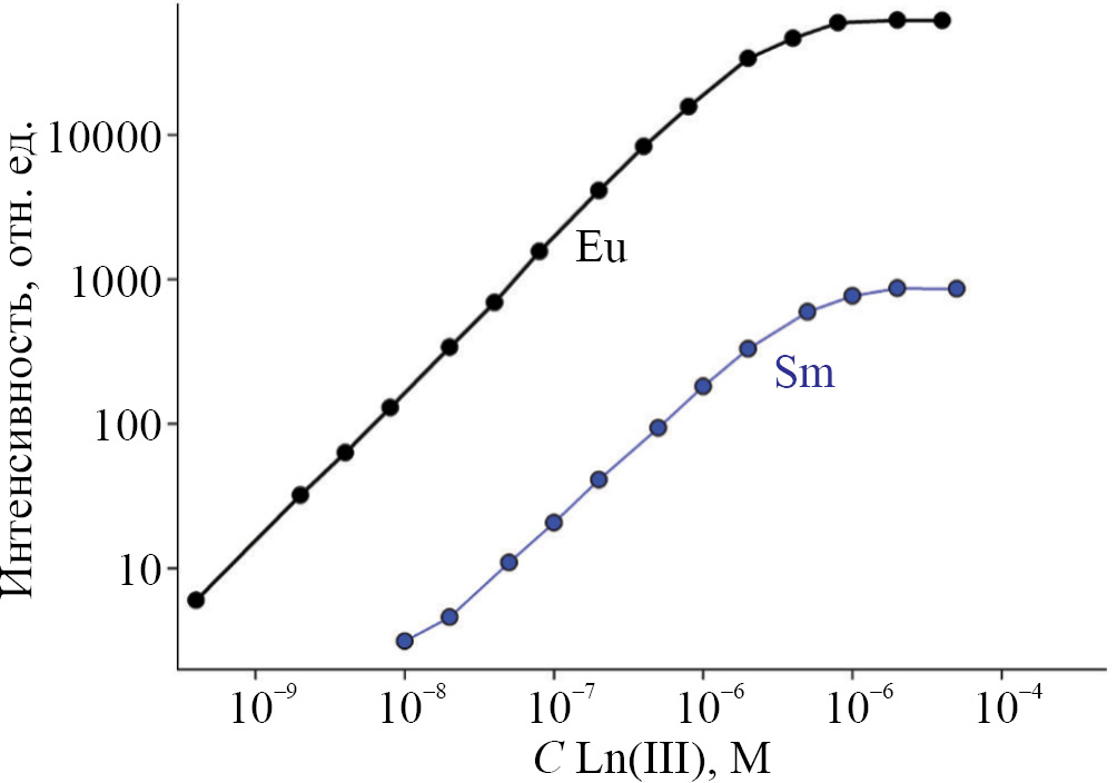 На рис. 3 представлены зависимости интенсивности люминесценции от концентраций Eu(III) и Sm(III) в оптимальных для определения этих металлов условиях. Установлено, что линейность градуировочных графиков соблюдается в широком диапазоне концентраций: (5 × 10–10)–(5 × 10–6) М с пределом обнаружения 1 × 10–10 М для европия(III) и (5 × 10–8)–(5×10–6) М с пределом обнаружения 1 × 10–8 М для самария(III).