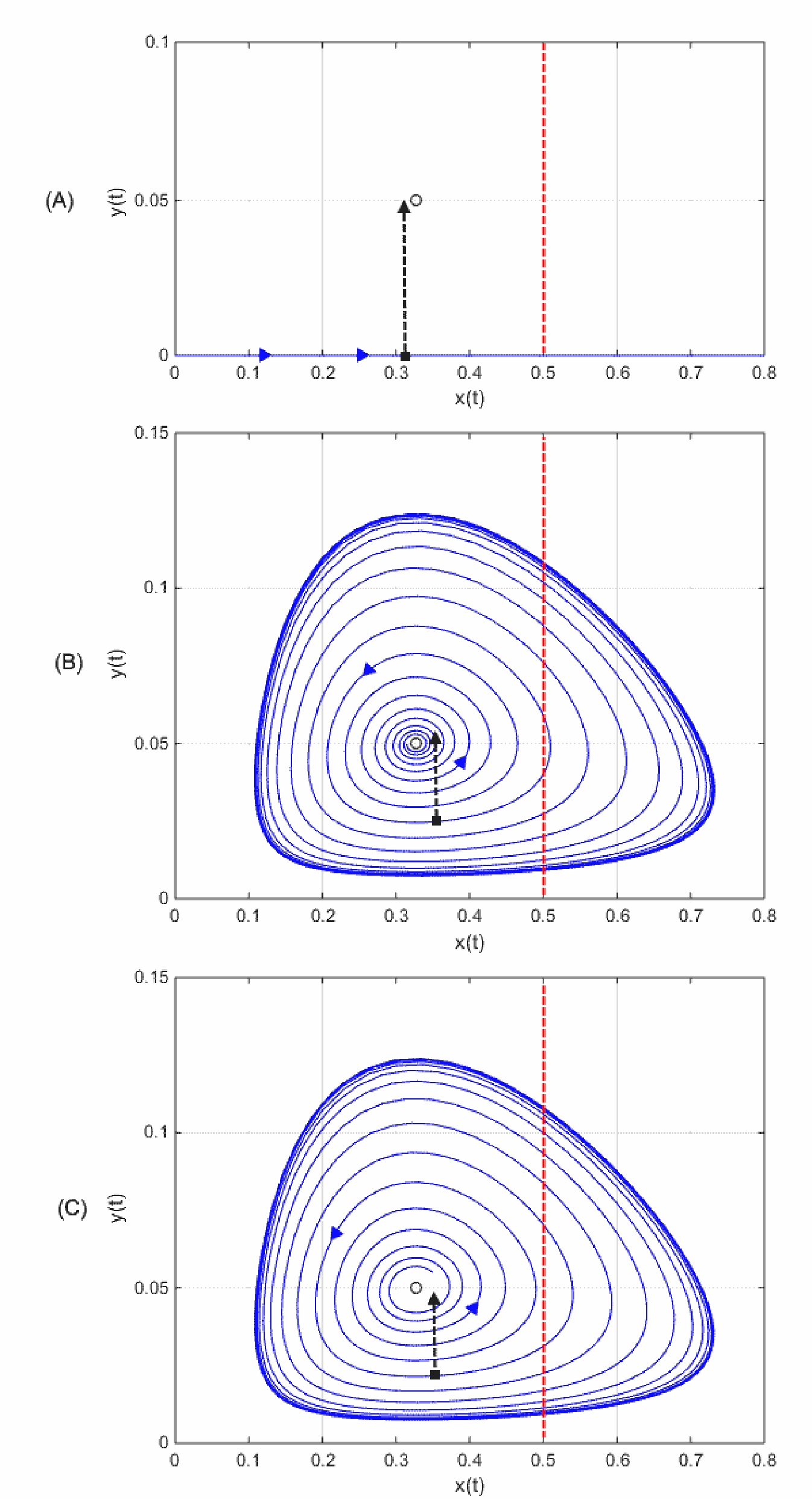 Настоящая работа не преследует цели отыскания оптимальных управляющих стратегий, однако мы приведем эвристическую схему построения стратегии импульсного управления системой «хищник-жертва», исследованной в предыдущем параграфе. Пусть Фазовый портрет данной системы изображен на рисунке 2 (A). С учетом имеющегося знания о координатах положения равновесия рассматриваемой системы, применим операцию внесения энтомофагов в тепличную систему в количестве в такой момент времени что В силу того, что численность популяций в тепличной экосистеме может быть оценена при помощи системы (1.1) лишь приближенно, будем полагать, что момент реализации импульсного воздействия определяется квадратом на конце черного пунктирного вектора (при этом длина вектора равна величине см. рисунок 2 (A)). Фазовое состояние системы, таким образом (с учетом погрешностей), переместилось в окрестность положения равновесия E (положение равновесия изображено черной окружностью, см. рисунок 2 (B)). Следующим моментом применения управления предлагается наибольшее значение предшествующее возникновению общих точек кривой фазового состояния и линии порогового значения поражения агрокультуры (отображена красным пунктиром). С учетом неизбежных погрешностей, будем полагать, что момент импульсного воздействия определяется квадратом на конце черного пунктирного вектора (при этом длина вектора равна величине см. рисунок 2 (B)). Фазовое состояние системы переместилось в окрестность положения равновесия (изображено черной окружностью, см. рисунок 2 (С)). Следующим моментом применения управления предлагается наибольшее значение (см. рисунок 2 (С)), предшествующее возникновению общих точек кривой фазового состояния и линии порогового значения поражения агрокультуры. Модуль применяемого импульсного воздействия при этом равен И так далее ... Итоговая стоимость поддержания популяции вредителя в допороговом состоянии будет пропорциональна сумме длин черных пунктирных векторов. Естественным образом, ключевую роль в снижении стоимости реализации подобных управляющих стратегий играет высокая точность оценки численности популяций вредителя и энтомофага, позволяющая, путем внесения необходимых количеств особей энтомофага в тепличный комплекс, переводить состояние системы как можно ближе к ее положению равновесия.