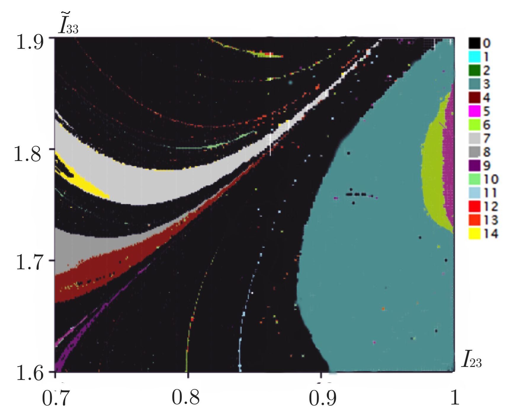 На рис. 6 представлена карта динамических режимов на плоскости параметров ( I 23 , I ˜ 33 ), MathType@MTEF@5@5@+= feaahGart1ev3aaatCvAUfeBSjuyZL2yd9gzLbvyNv2CaerbuLwBLn hiov2DGi1BTfMBaeXatLxBI9gBaerbd9wDYLwzYbItLDharqqtubsr 4rNCHbGeaGGj0Jf9crFfpeea0xh9v8qiW7rqqrFfpeea0xe9Lq=Jc9 vqaqpepm0xbba9pwe9Q8fs0=yqaqpepae9pg0FirpepeKkFr0xfr=x fr=xb9adbaqaaeGaciGaaiaabeqaamaabaabaaGcbaGaaGikaiaadM eadaWgaaWcbaGaaGOmaiaaiodaaeqaaOGaaGilaiaaygW7ceWGjbGb aGaadaWgaaWcbaGaaG4maiaaiodaaeqaaOGaaGykaiaaiYcaaaa@416C@  где параметры лежат в интервалах I 23 [0.7,1] MathType@MTEF@5@5@+= feaahGart1ev3aaatCvAUfeBSjuyZL2yd9gzLbvyNv2CaerbuLwBLn hiov2DGi1BTfMBaeXatLxBI9gBaerbd9wDYLwzYbItLDharqqtubsr 4rNCHbGeaGGj0Jf9crFfpeea0xh9v8qiW7rqqrFfpeea0xe9Lq=Jc9 vqaqpepm0xbba9pwe9Q8fs0=yqaqpepae9pg0FirpepeKkFr0xfr=x fr=xb9adbaqaaeGaciGaaiaabeqaamaabaabaaGcbaGaamysamaaBa aaleaacaaIYaGaaG4maaqabaGccqGHiiIZcaaIBbGaaGimaiaai6ca caaI3aGaaGilaiaaigdacaaIDbaaaa@4178@  и I ˜ 33 [1.6,1.9]. MathType@MTEF@5@5@+= feaahGart1ev3aaatCvAUfeBSjuyZL2yd9gzLbvyNv2CaerbuLwBLn hiov2DGi1BTfMBaeXatLxBI9gBaerbd9wDYLwzYbItLDharqqtubsr 4rNCHbGeaGGj0Jf9crFfpeea0xh9v8qiW7rqqrFfpeea0xe9Lq=Jc9 vqaqpepm0xbba9pwe9Q8fs0=yqaqpepae9pg0FirpepeKkFr0xfr=x fr=xb9adbaqaaeGaciGaaiaabeqaamaabaabaaGcbaGabmysayaaia WaaSbaaSqaaiaaiodacaaIZaaabeaakiabgIGiolaaiUfacaaIXaGa aGOlaiaaiAdacaaISaGaaGymaiaai6cacaaI5aGaaGyxaiaai6caaa a@43BB@  Области черного цвета с цветными включениями соответствуют параметрам системы со странным аттрактором. Подтверждается сценарий Фейгенбаума о появлении странного аттрактора в результате каскада бифуркаций удвоения периода.
