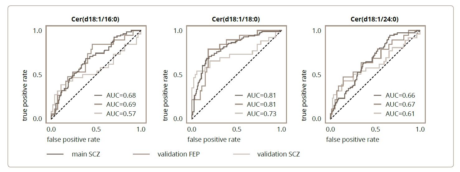 Figure 2. The receiver operating characteristic (ROC) curves for the naïve classifiers that were based on each of the ceramides’ abundances: Cer(d18:1/16:0), Cer(d18:1/18:0), and Cer(d18:1/24:1). Each ceramide species, in conjunction with an abundance threshold, represents a naive classifier, with individuals with abundances higher than the cutoff threshold classified as the psychiatric patient group, and individuals with abundances lower the cutoff – as CTL group. For each ceramide, the ratio of the true positive classifications is plotted against the ratio of false positive classifications for the different cutoff thresholds. Colours correspond to the different classification tasks: main cohort SCZ vs. CTL (dark red), validation cohort FEP vs. CTL (red), validation cohort SCZ vs. CTL (orange). The corresponding areas under the curves (AUCs) are indicated on the plots.