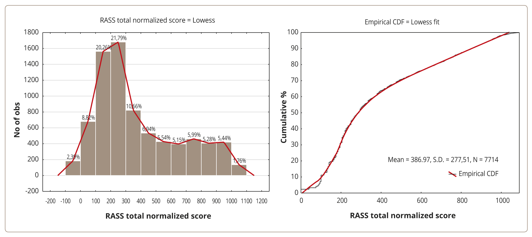 As a second step, we projected our survey data onto the entire adult (≥18 years old) population of Russia using population data registered by the Federal State Statistics Service on December 31st, 2020 [57]. We calculated a population distribution by set age groups (18–19, 20–24, 25–29, 30–34, 35–39, 40–44, 45–49, 50–54, 55–59, 60–64, 65–69, 70–74, 75–79, 80–84, >84 years), gender (male, female) and residence (urban, village) and made a raking weighting of our survey data by applying a weight to every case in terms of descriptive analysis of socio-demographic variables and total RASS scores. Also, insofar as the RASS scale has no clearly defined cut-offs, we analyzed total RASS score (both raw and standardized) distributions and D’Agostino Skewness against the normal distribution to determine normal scores’ cut-offs and the proportion of the population with abnormal scores.