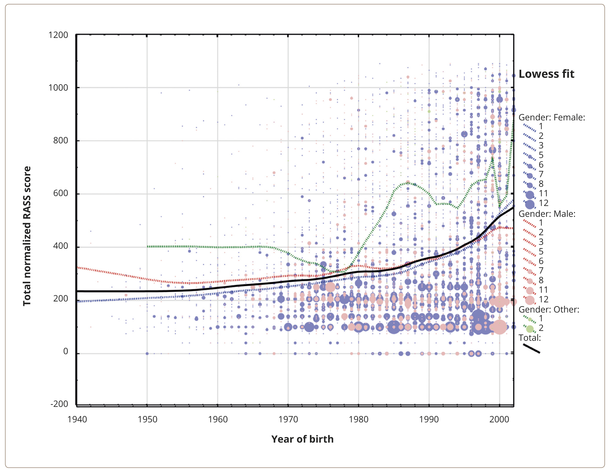 Those variables that survived in the LASSO regression after minimal Lambda values were achieved were entered as either categorical or continuous predictors, respectively, into two General linear regression best subset models with R2 selected as a goodness criterion and the total standardized RASS score as the dependent variable. For the general regression model with the ordinal variables treated as categorical, an ANOVA with post-hoc Bonferroni correction for multiple comparisons was performed to calculate the total RASS score mean values (Mean) with 95% confidence intervals (CIs) across the categories and to evaluate the between-group comparisons.