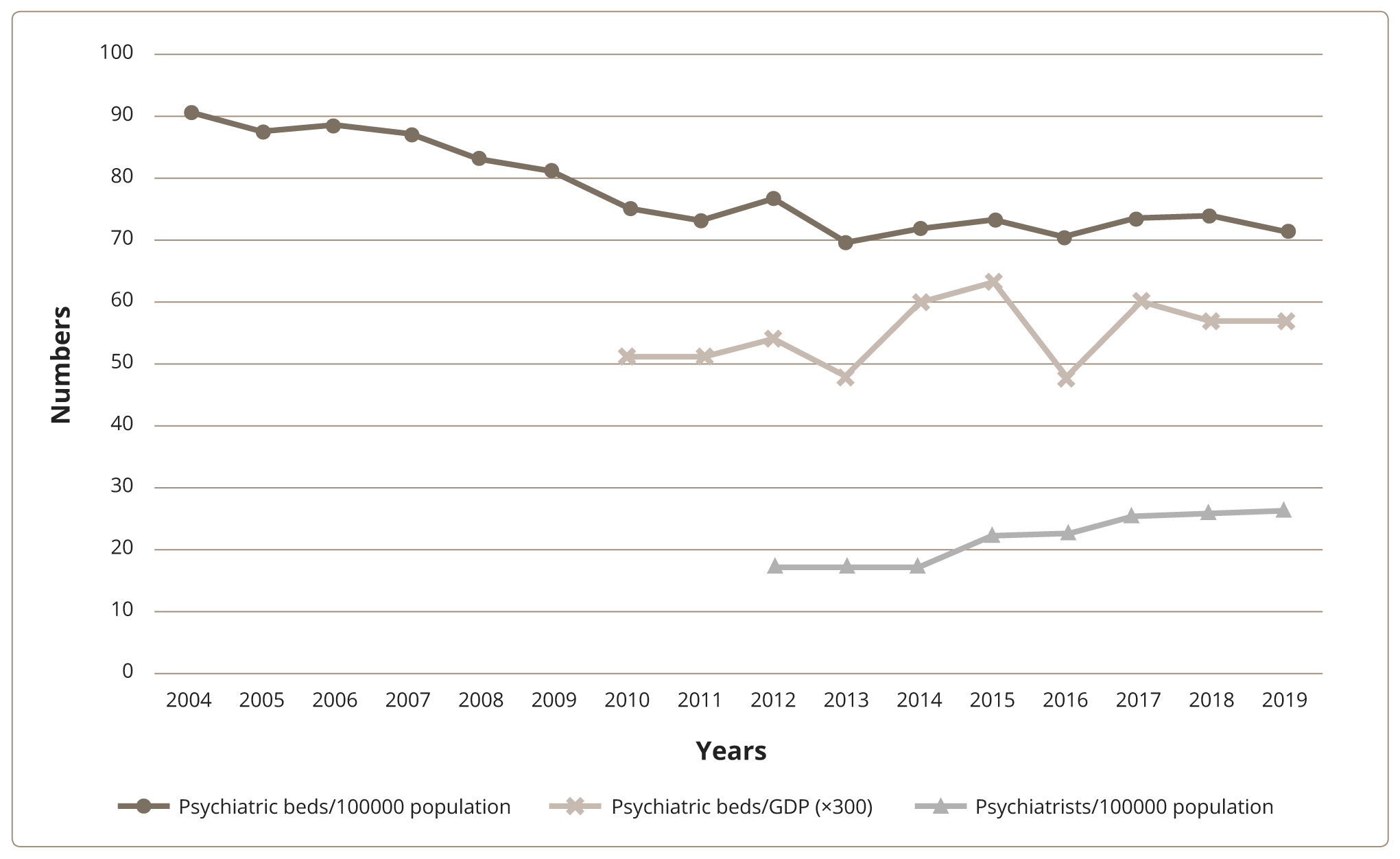 Рисунок 1. Тенденции реформы психиатрии в Греции: тенденции в психиатрических койках и общем количестве психиатров.
