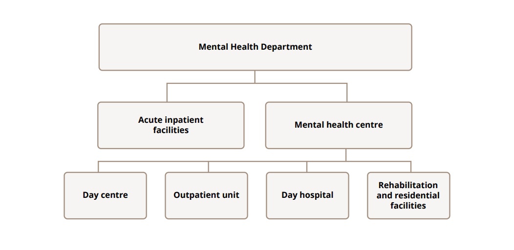By 2000, all psychiatric hospitals had been closed and all patients discharged. Mental health care is organized through the Department of Mental Health, which is the umbrella organization responsible for specialist mental health care in the community; this includes psychiatric wards located in general hospitals, residential facilities, mental health centres, and day-hospital and day-care units.