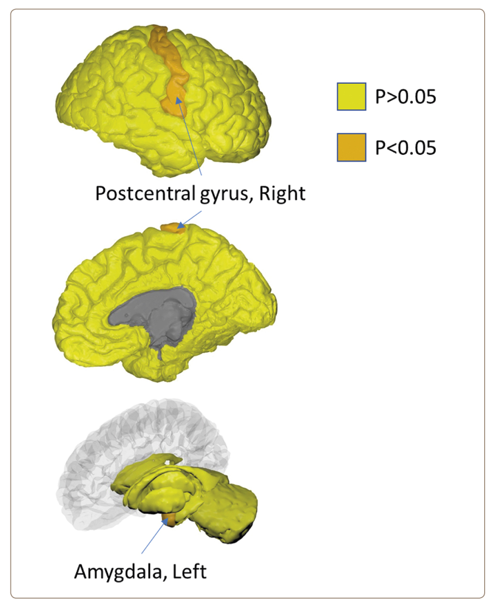 Comparison of brain regional volumes in whole study population (n=207) revealed differences only in two regions: right postcentral gyrus (median 8055.5 mm3 in COVID+ vs. 8434.0 mm3 in COVID-, U=1821.5, p=0.045, Mann-Whitney test) and left amygdala (median 1199.3 mm3 in COVID+ vs. 1263.7 mm3 in COVID-, U=1839.0, p=0.044, Mann-Whitney test) (Figure 1).