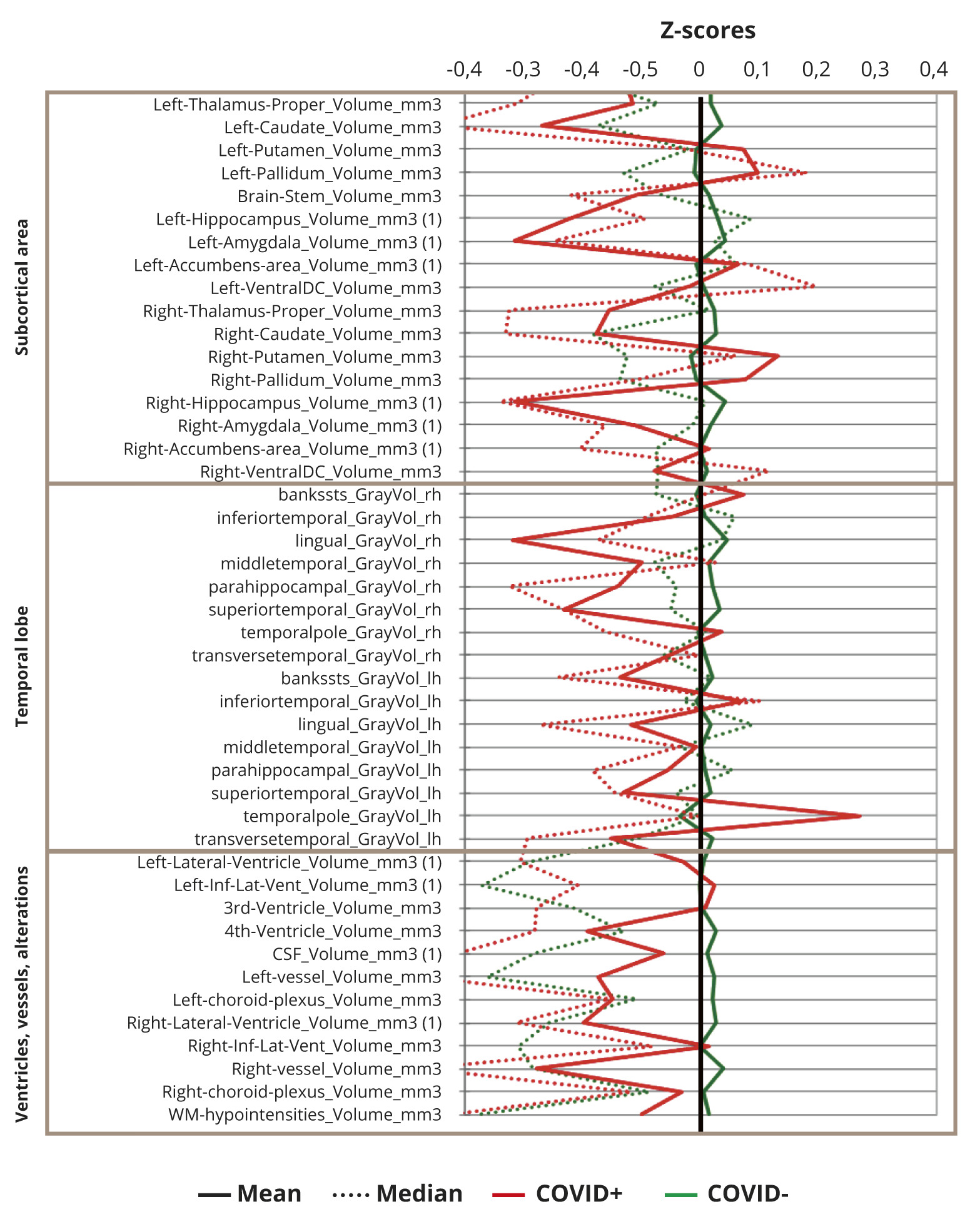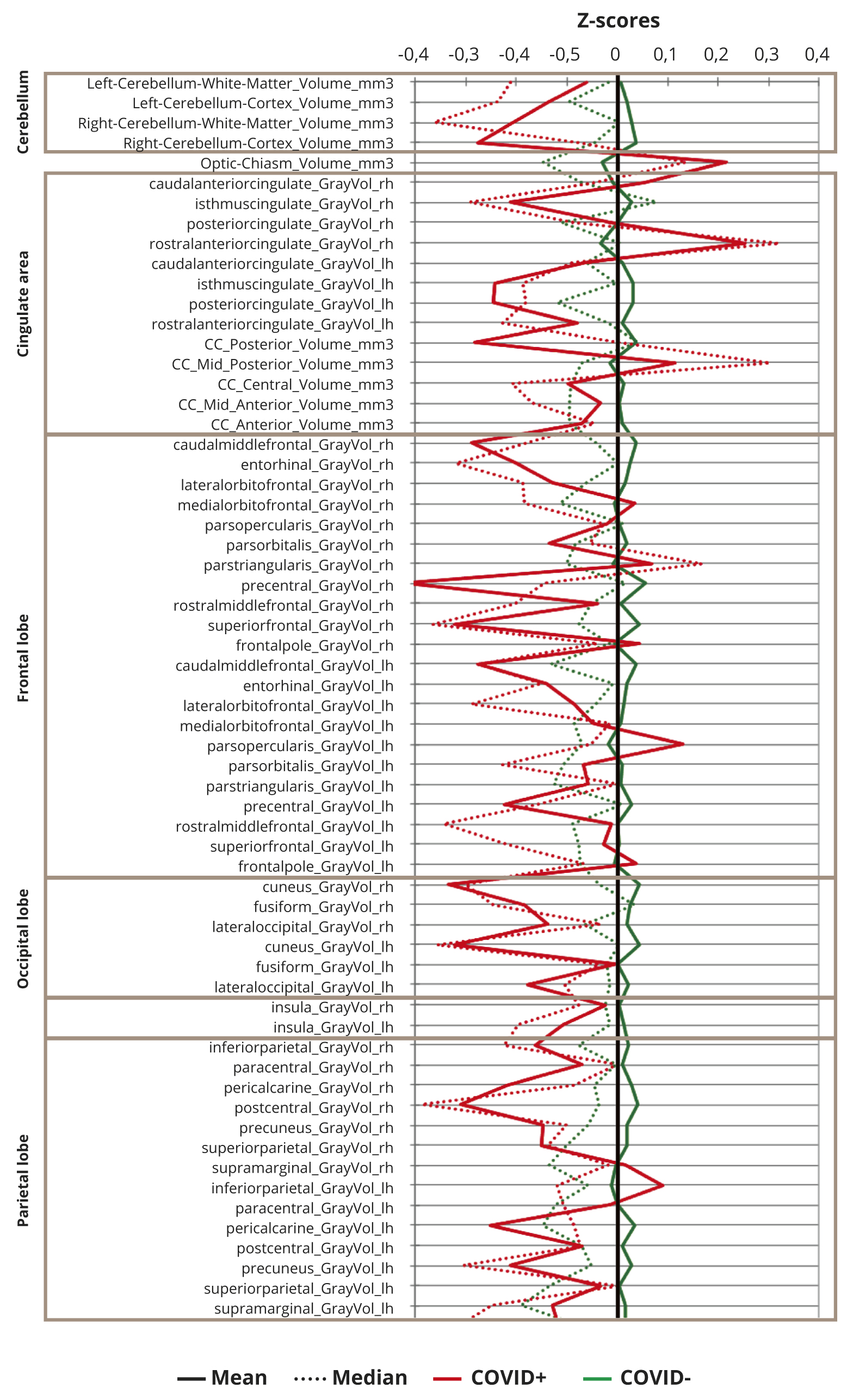 None of means or medians of z-scores exceed 1, reflecting that there were no differences in regional brain volumes larger than one standard deviation of study population means, though, generally most of z-scores are slightly decreased in COVID+ against COVID- subjects.
