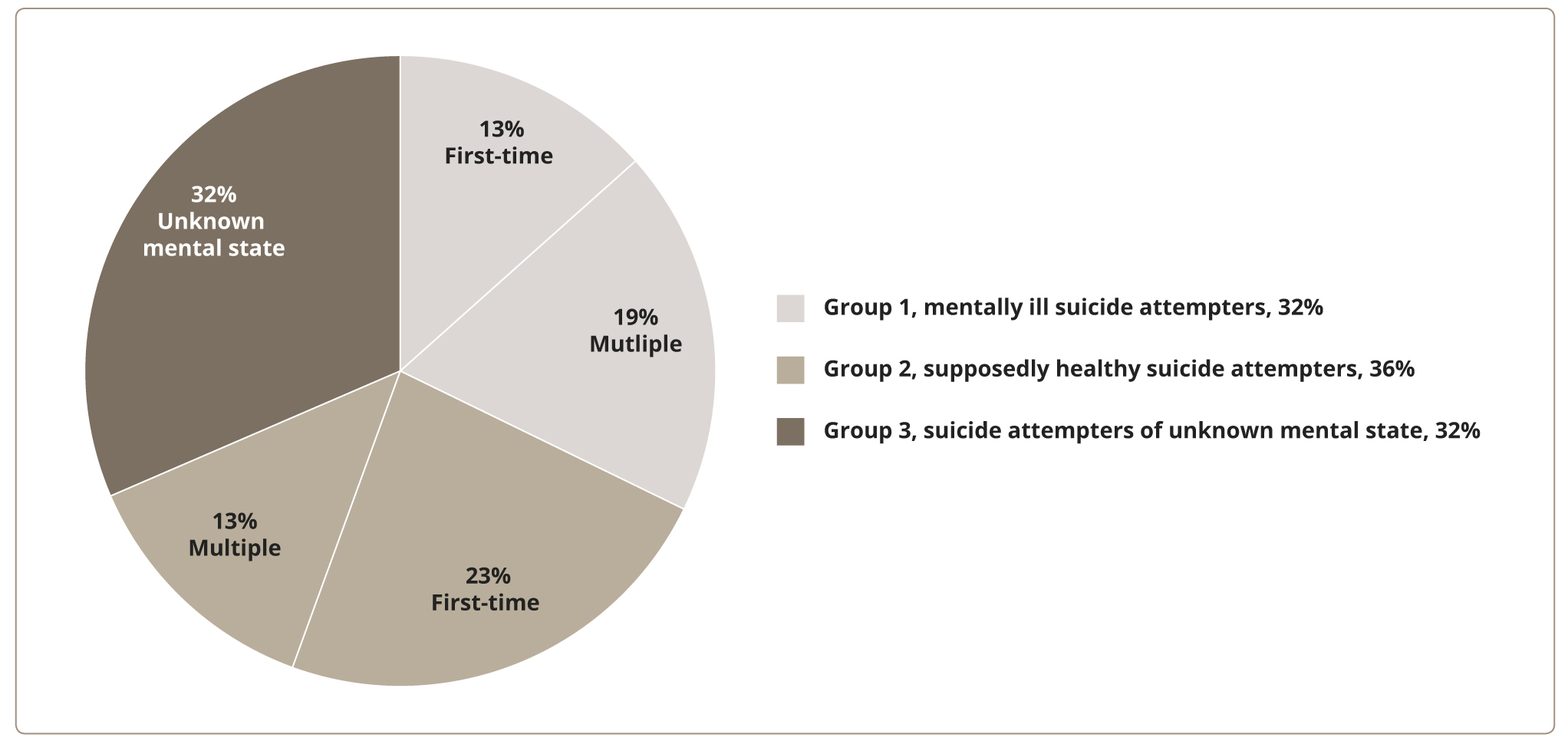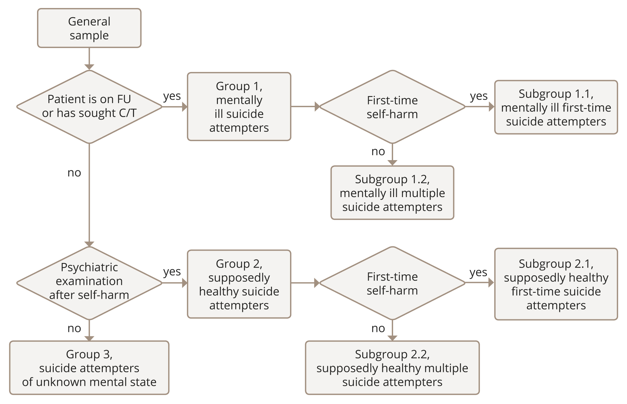- Cases of intentional self-harm in patients who had not sought psychiatric help (from state-run healthcare facilities), had no established diagnosis of a mental disorder at the time of the self-harm, and who had not been examined by a psychiatrist after the attempt (Group 3, suicide attempters of unknown mental state).