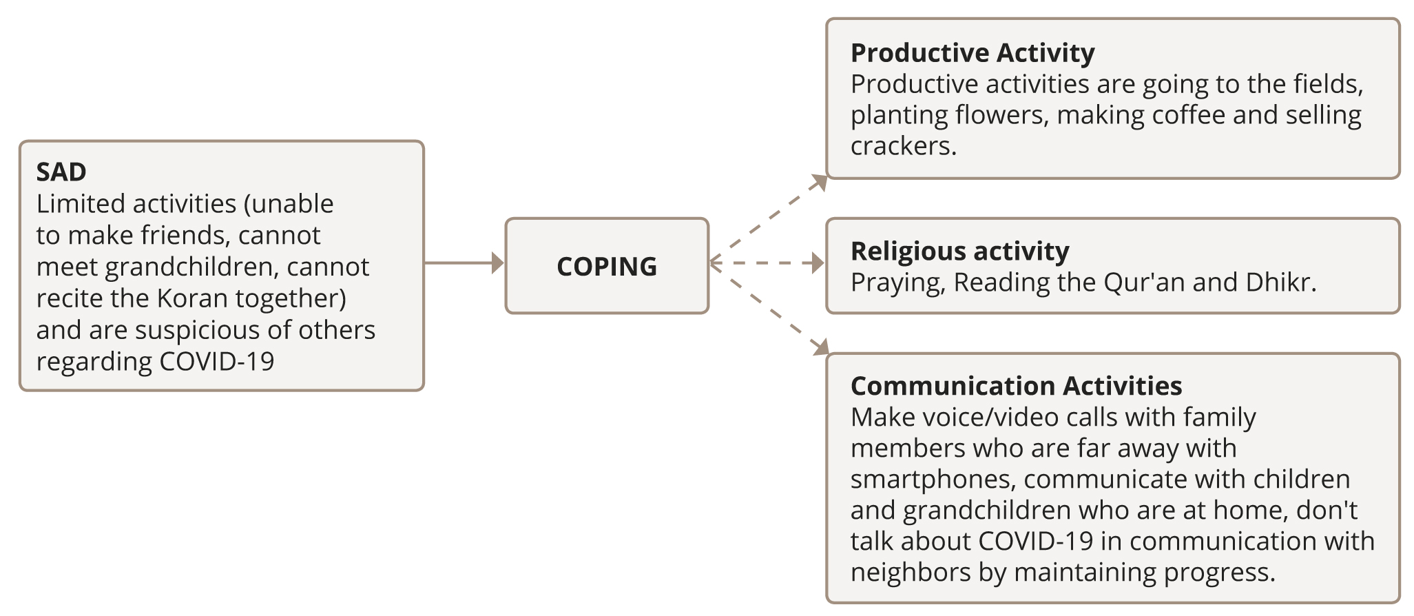 Based on the results of interviews with nine elderly people related to psychological distress and psychological well-being, the flow of themes found in the interviews is shown in Figure 1. It can be seen that elderly individuals could feel sad (part of psychological distress) for various reasons such as limited activities, being unable to meet distant family members, and a suspicion of being among people affected by the COVID-19 virus, then coping with these could be themed into three forms to relieve sadness. The first form of coping includes pursuing productive activities as a form of diversion. The second form of coping is performing religious activities, including prayer, reading the Qur’an, and dhikr. The third form of coping is communication activities, such as making voice or video calls with smartphones, communicating with family members at home, and diverting communication about COVID-19. Coping strategies create happy feelings such as healthy family members, being close to children and grandchildren at home and far away, feeling cared for, and not feeling suspicious in communication with neighbors.