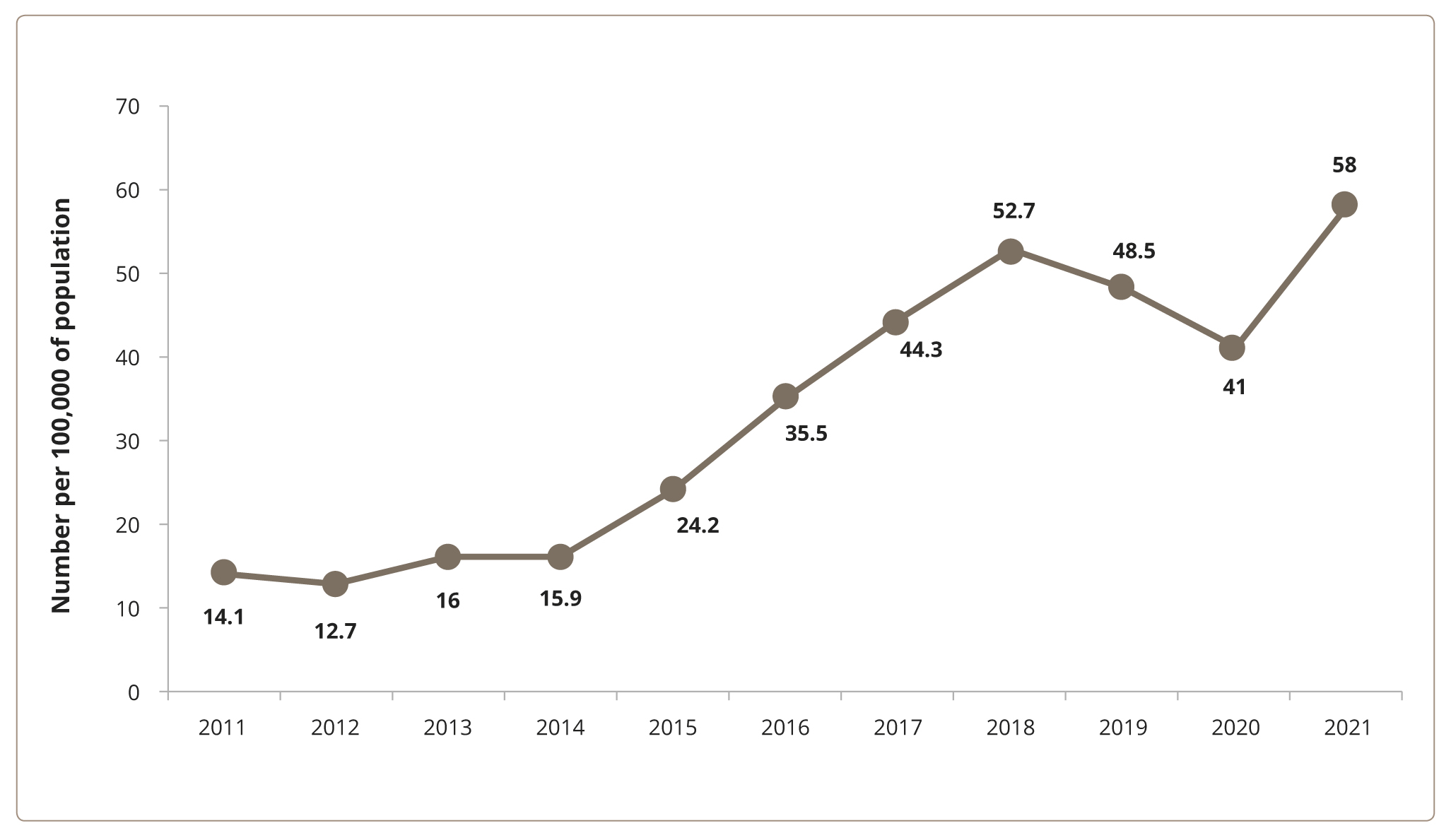 Figure 1. Number of children and adolescents displaying suicidal behavior per 100,000 of Moscow’s child population.