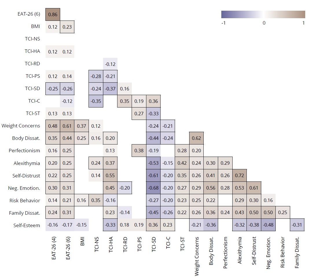 The Spearman correlation analysis was used to estimate how EAT-26 total, BMI, TCI-R, RFED and self-esteem characteristics relate to each other.