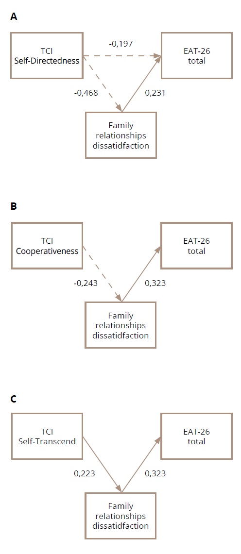 Path analysis using EQS 6.4 soft was utilized to identify any significant mediation of the influence of one variable on another. BMI and seven traits of temperament and character (TCI-R) were used as independent variables. The EAT-26 total score assessed on a 6-point scale was treated as a dependent variable, and Family Relationships Dissatisfaction as a mediator variable.