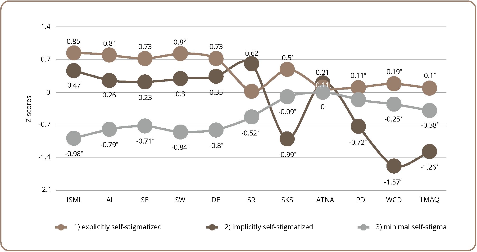 Twenty patients from Cluster 2 (32% of the sample) were more self-stigmatized (Mean dif.=0.71, S.E.=0.09, sig. <0.001) compared to subjects from Cluster 3 due to a lower level of resistance to self-stigmatization (Mean dif.=-0.71, S.E.=0.17, sig. <0.001). The stigma subtype of Cluster 2 patients was defined as an “implicit” stigma.