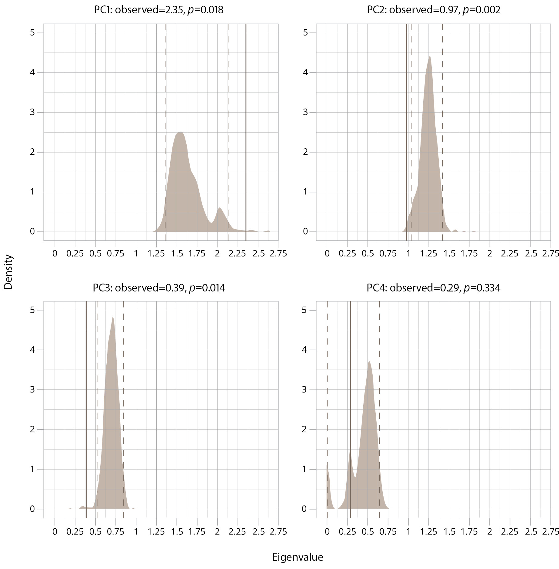 Figure 1. A graphical representation of the eigenvalue comparison with the null distribution by the bootstrap method in the sample. Note: PC — principal component; p — p-value; shade area — null distribution; solid line — observed eigenvalue; dashed line — 95% confidence interval under null distribution.