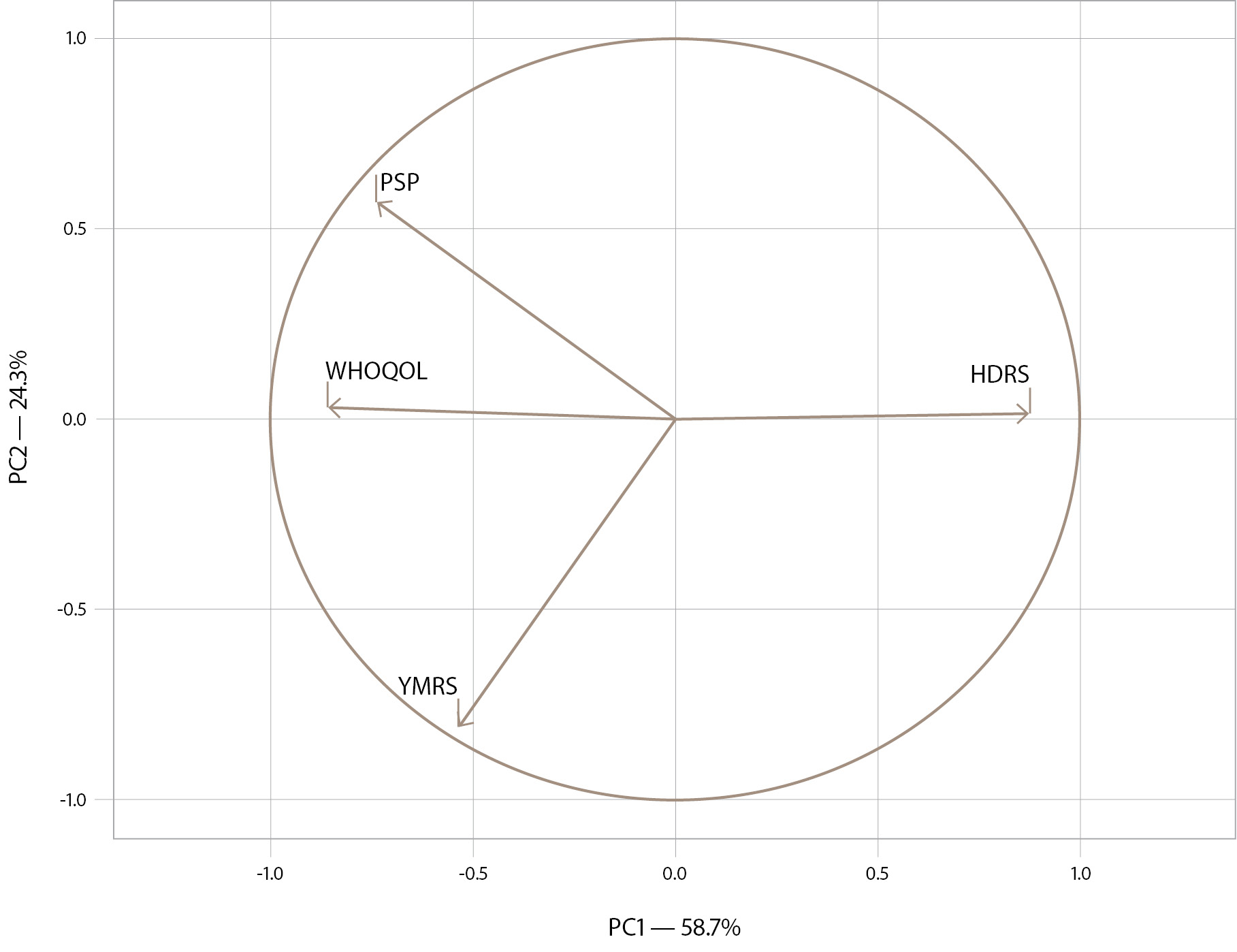 Figure 2. The loading plot of the burden of illness in patients with BD in remission. Note: HDRS — Hamilton Depression Rating Scale; YMRS — Young Mania Rating Scale; WHOQOL — World Health Organization’s Quality of Life Questionnaire; PSP — Personal and Social Performance Scale; PC – principal component.