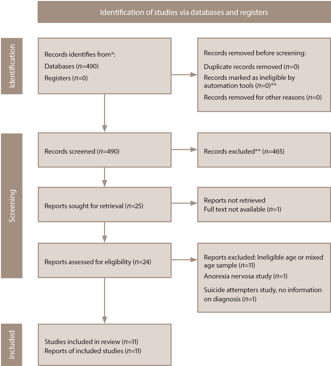 The search query identified 490 publications. After reviewing the titles of the articles and their abstracts, 465 publications were excluded as not relevant to the scope of the review (the reasons for the exclusion of each source were not recorded at this stage). Of the remaining publications, 1 was excluded from the review due to the unavailability of the full text. After reviewing the full texts of 24 articles, we included 11 publications in the review [46–56]. The main reason for exclusion from analysis was that the studies were ineligible due to the age of the participants (Figure 1).