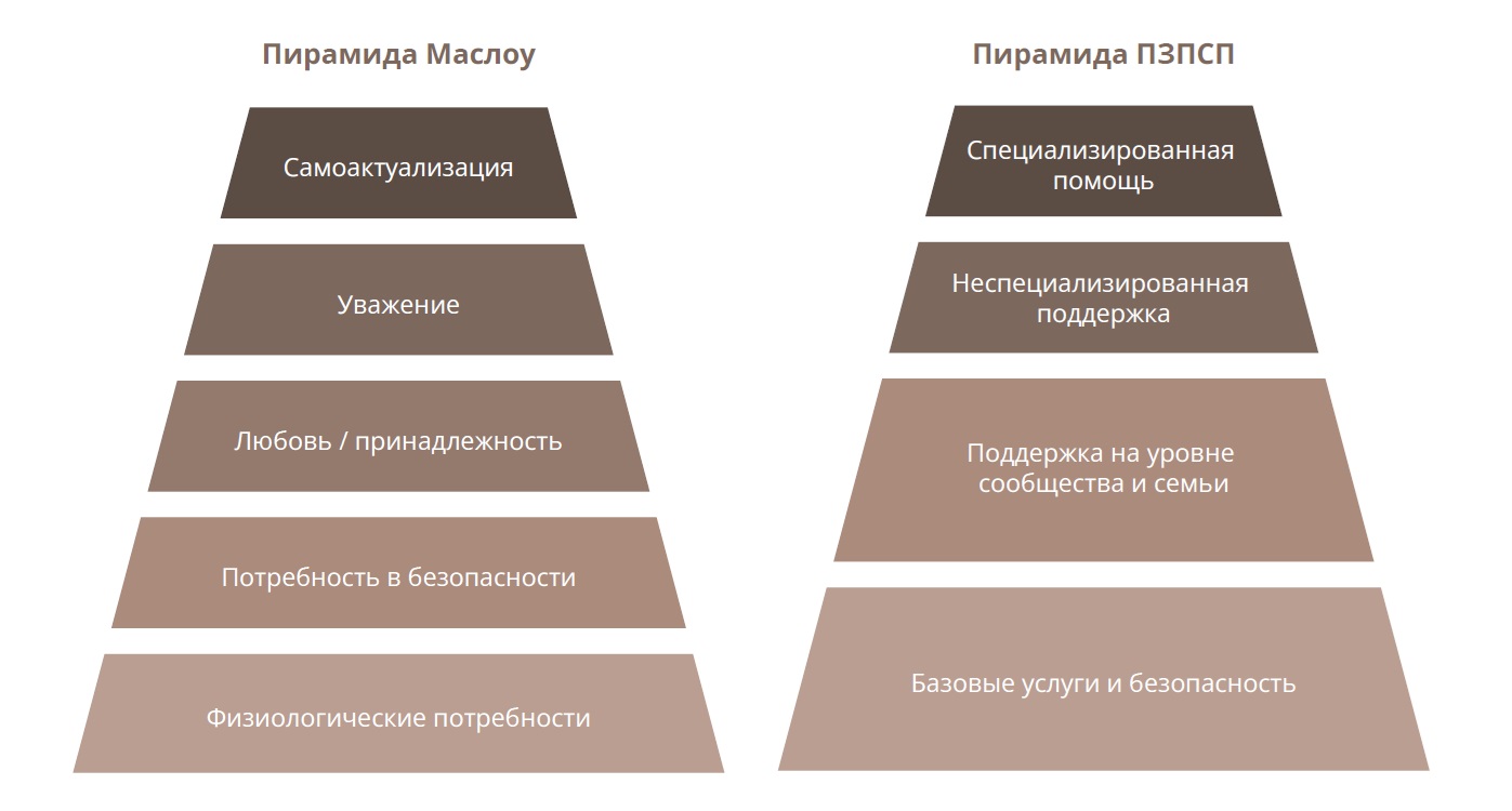 ВВЕДЕНИЕ: Пирамида Маслоу и пирамида Психического здоровья и психосоциальной поддержки (ПЗПСП) — базовые инструменты оценки степени удовлетворенности потребностей индивида или группы людей. Сотрудники неправительственных организаций (НПО) часто испытывают затруднения в применении этих методик и плохо понимают отличия между моделями, лежащими в их основе.