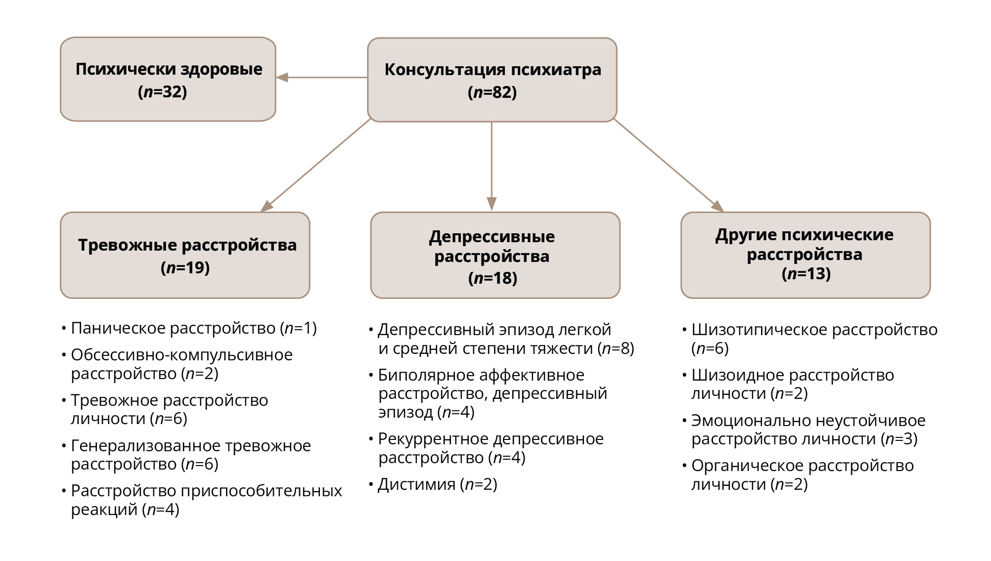 По заключению врачей-психиатров, из 82 пришедших на консультацию психически здоровыми признаны 32 (39%) участника, аффективные расстройства с ведущим депрессивным синдромом (депрессивные расстройства) обнаружены у 19 (23%) человек, невротические расстройства с преобладанием тревожной симптоматики (тревожные расстройства) — у 18 (22%) человек, другие психические расстройства — у 13 (16%) человек (рис. 1).