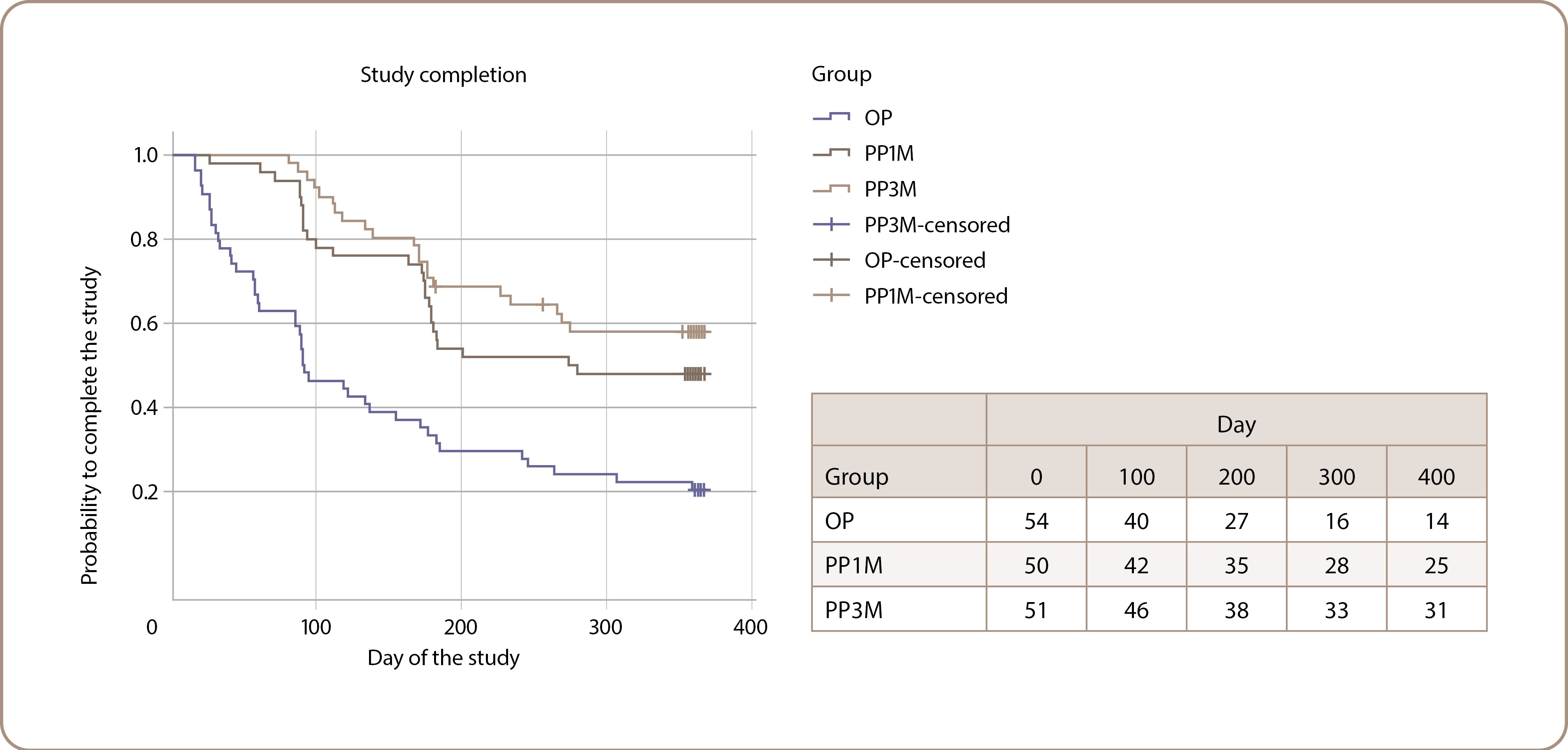 Number of hospitalizations Mean (SD) | 3.65 (4.05) | 4.50 (4.03) | 5.08 (4.75) | 4.39 (4.30) | OP vs PP1M: MD=-0.852; t=-1.01; df=152; p=0.570 OP vs PP3M: MD=-1.430; t=-1.709; df=152; p=0.205 PP1M vs PP3M: MD=-0.578; t=-0.678; df=152; p=0.777 |