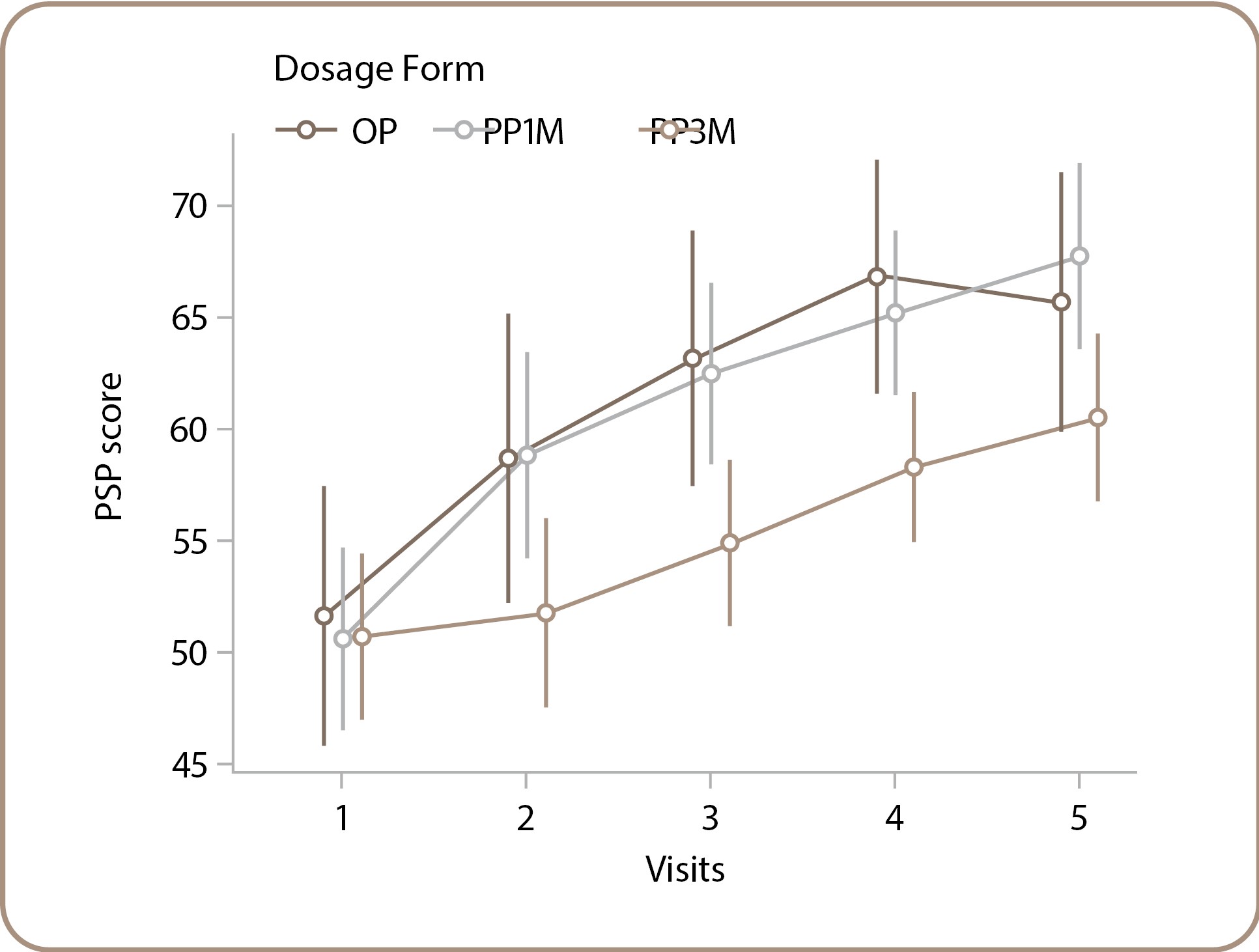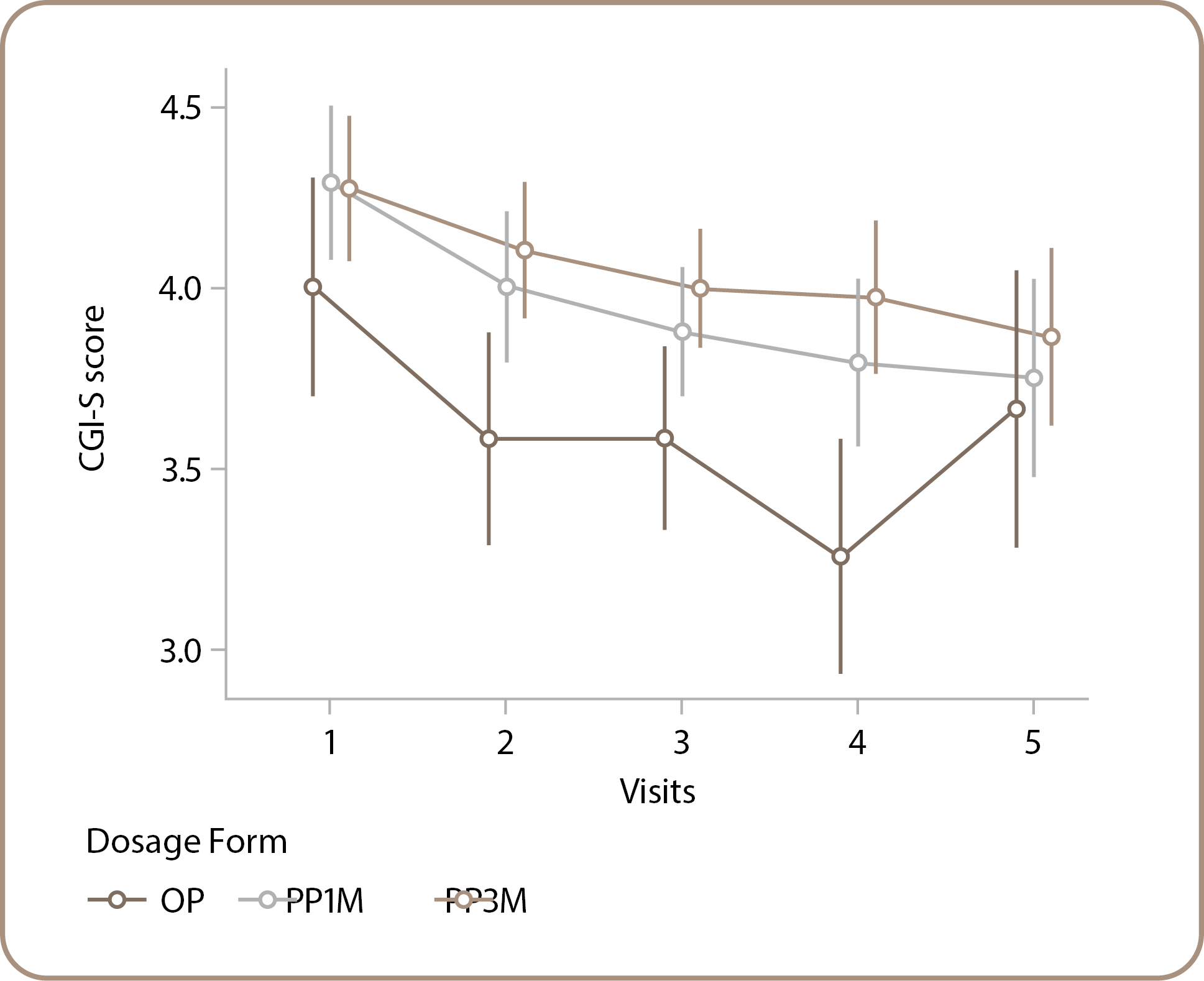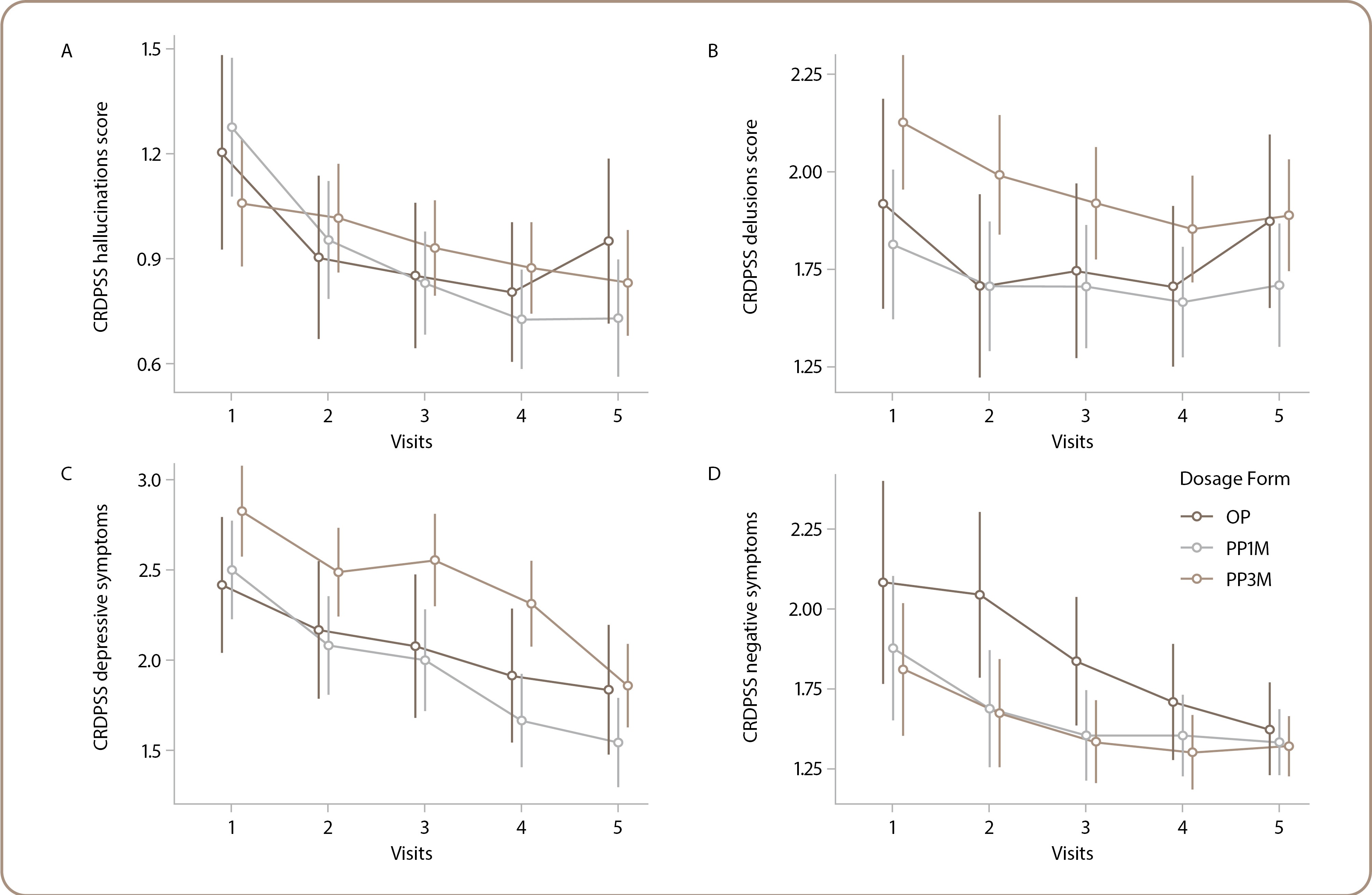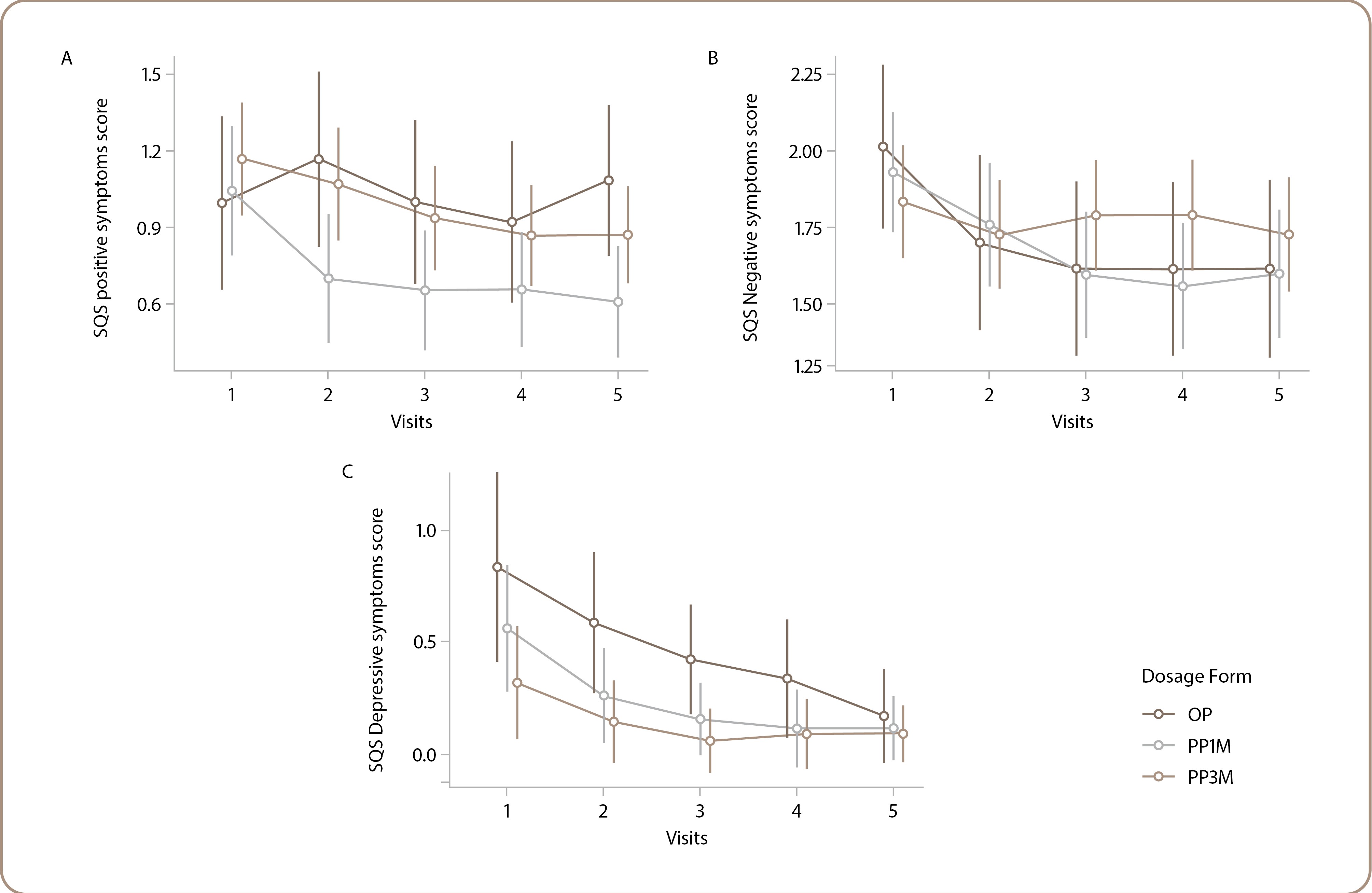 CONCLUSION: Treatment with different forms of paliperidone provides a roughly equal pace reduction in the severity of schizophrenia, including positive and negative symptoms. The PP3M group had better adherence and the highest number of patients who fully completed the study.