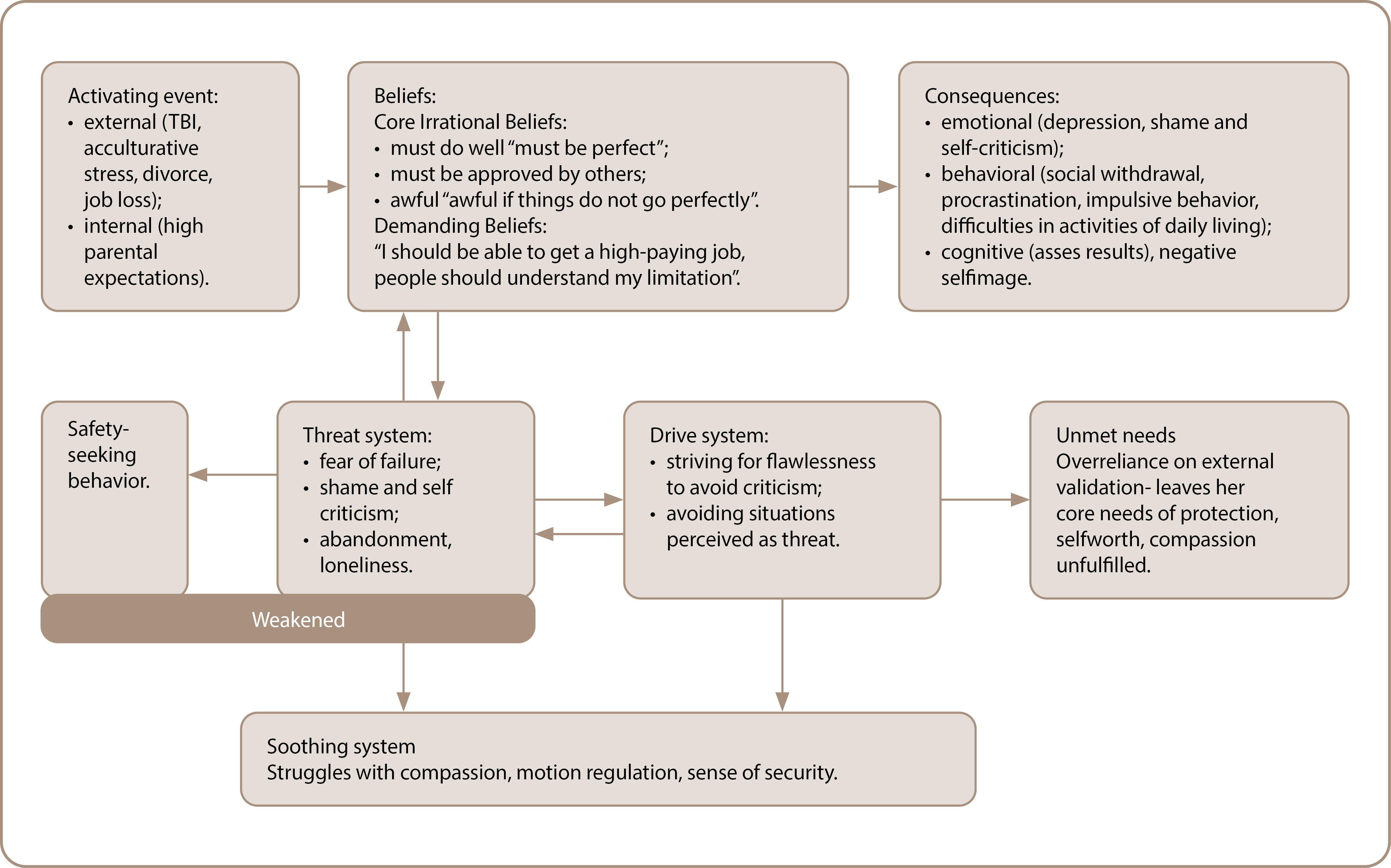 The patient, a female in her late thirties, from a middle-class socioeconomic background, is educated, with an upbringing characterized by high parental expectations. The parents instilled in her the need to strive for perfection in all life endeavors. She has encountered several life challenges, including TBI, acculturative stress, job loss, and marital dissolution. These experiences have led her to internalize the belief that she must always meet high standards, fulfill others’ expectations, and seek their approval.