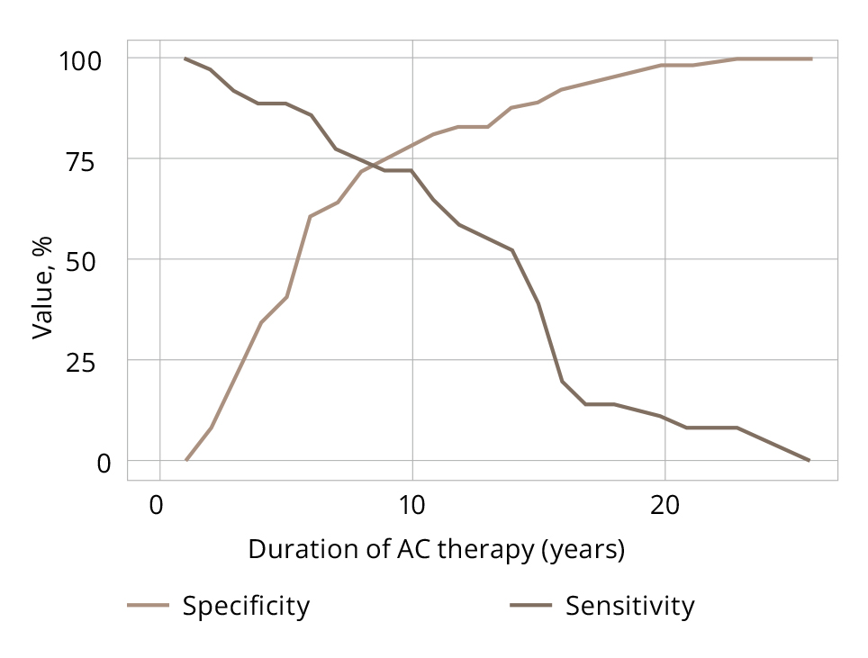 Table 6. Threshold values of the duration of anticonvulsant therapy and the probability of fracture according to the ROC model, taking into account the sensitivity and specificity