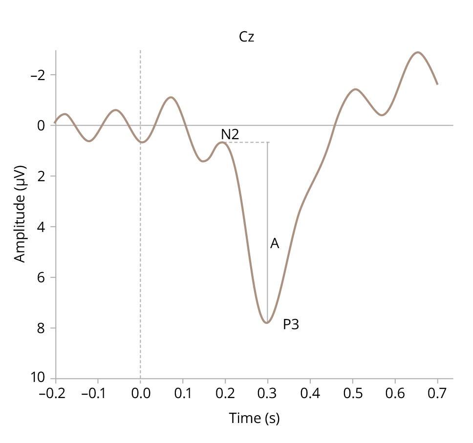 Note: The method for measuring the amplitude (A) of the P3 component is indicated. N2 — the preceding negative peak. Vertical dashed line — the time of stimulus presentation.